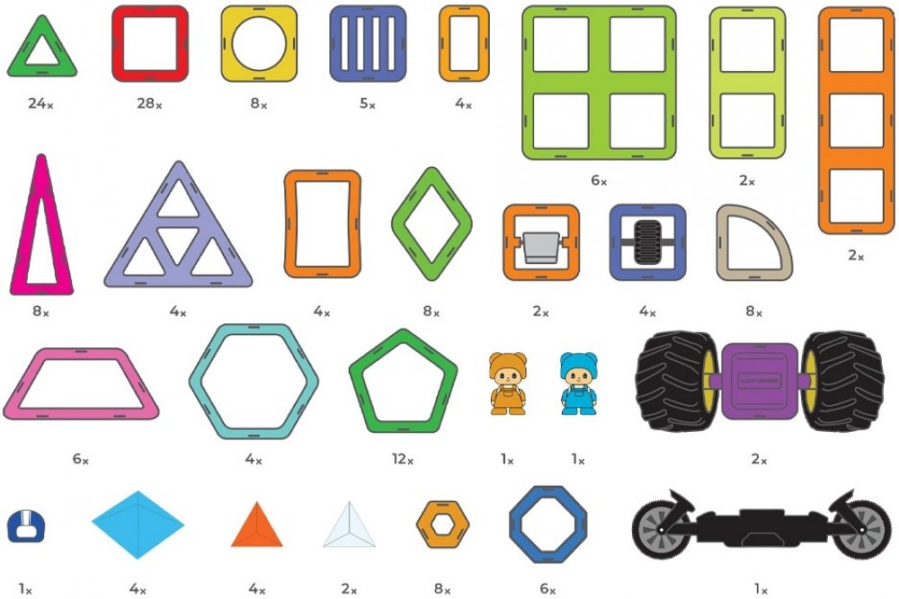 Trojúhelník 24xVysoký trojúhelník 8xSUPER trojúhelník 4xČtverec 28xČtverec s kruhovým otvorem 8xMřížka 6xČtverec s mřížkou 5xObdélník 2xObdélníček 4xTrojitý obdélník 2xKosočtverec 8xLichoběžník 6xPětiúhelník 12xŠestiúhelník 4xVýseč 8xOblouk 4xMINI šestiúhelník 8xMINI osmiúhelník 6xŽlutá figurka 1xModrá figurka 1xHelma pro figurku 1xČtverec se sedačkou 2xJednokolečko 4xTransform kolečko 1xGIGA kolečka 2xLux pyramidy Color 4xLux/pyramidy trojboké 2xLux pyramidy trojboké Color 4x
