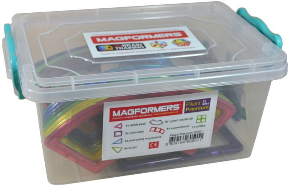 Pikant Premium je balení 25 dílků, kterými si můžete zajímavě doplnit již zakoupenou základní sadu MAGFORMERS. Balíček s vyváženou kombinací nových tvarů uvedených na trh v r. 2013. Určen pro ty, kteří již nějakou stavebnici Magformers mají a chtějí rozšířit její možnosti o nové konstrukční prvky. Baleno v plastovém sáčku. Počet dílků: 25 4 minivýseče 2 obloučky 2 pravoúhlé trojúhelníky 4 kužely 8 výsečí mezikruží 4 superoblouky 1 mřížku Kreativní magnetická stavebnice Magformers umožňuje sestavovat velké množství trojrozměrných objektů, pomocí dvourozměrných plastových mnohoúhelníků. Magformers procvičuje jemnou motoriku, podněcuje tvořivost, učí děti barvy a základní geometrické tvary. Rozměry dílků a vhodně volené tvary zajišťují maximální možnou bezpečnost hračky . Materiál, z kterého je stavebnice vyrobena splňuje nepřísnější hygienická a zdravotní kritéria. Dílky jsou dostatečně velké, nelze je spolknout a jsou prakticky nerozbitné MAGFORMERS lze velmi dobře kombinovat i se známou magnetickou stavebnicí Geomag. ilustrační video magnetické stavebnice Magformers