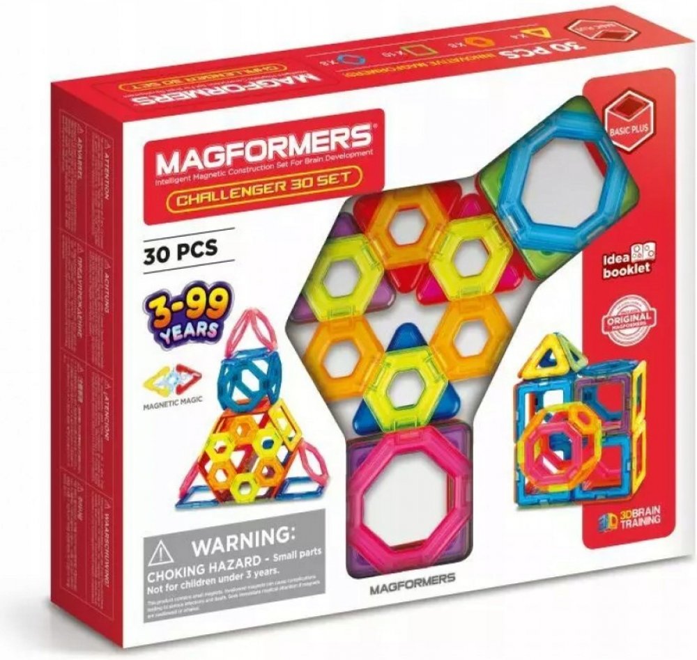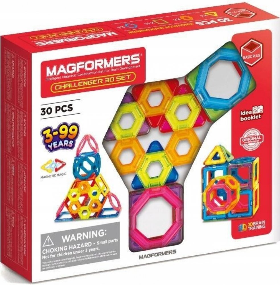 MAGFORMERS CHALLENGER SET jsou kostky se zabudovanými silnými neodymovými magnety, které se vždy vzájemně přitahují. Stačí přiblížit dva bloky k sobě jejich čelní stranou a okamžitě se spojí. Díky blokům vymodelovaným podle tvaru geometrických obrazců můžete stavět nádherné trojrozměrné stavby. Sada obsahuje: 4 trojúhelníky, 8 pětiúhelníků, 10 čtverců a 8 šestiúhelníků. Magformers PLUS 30 je zákla...