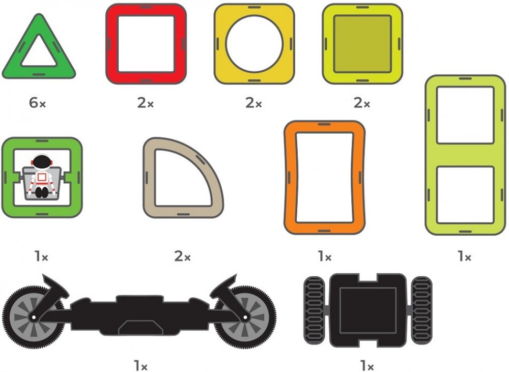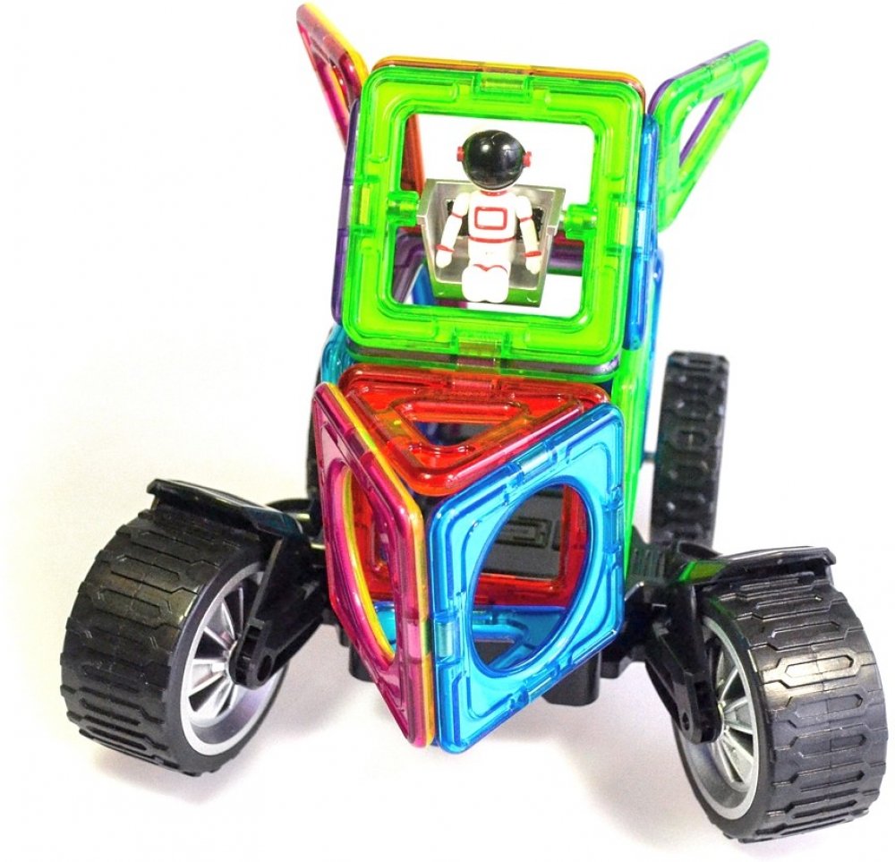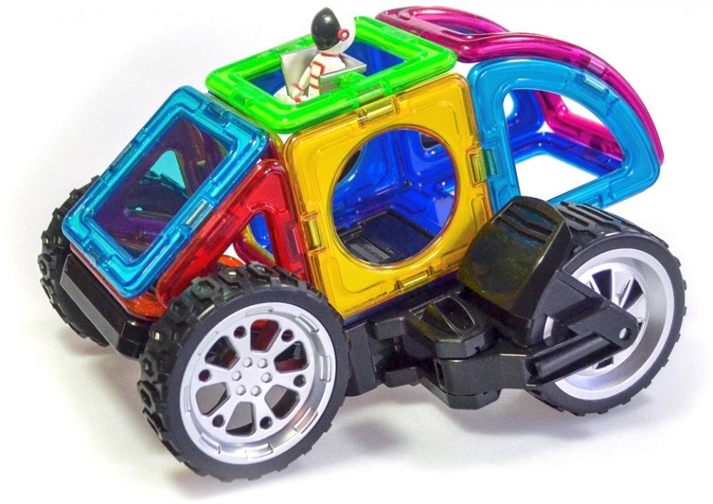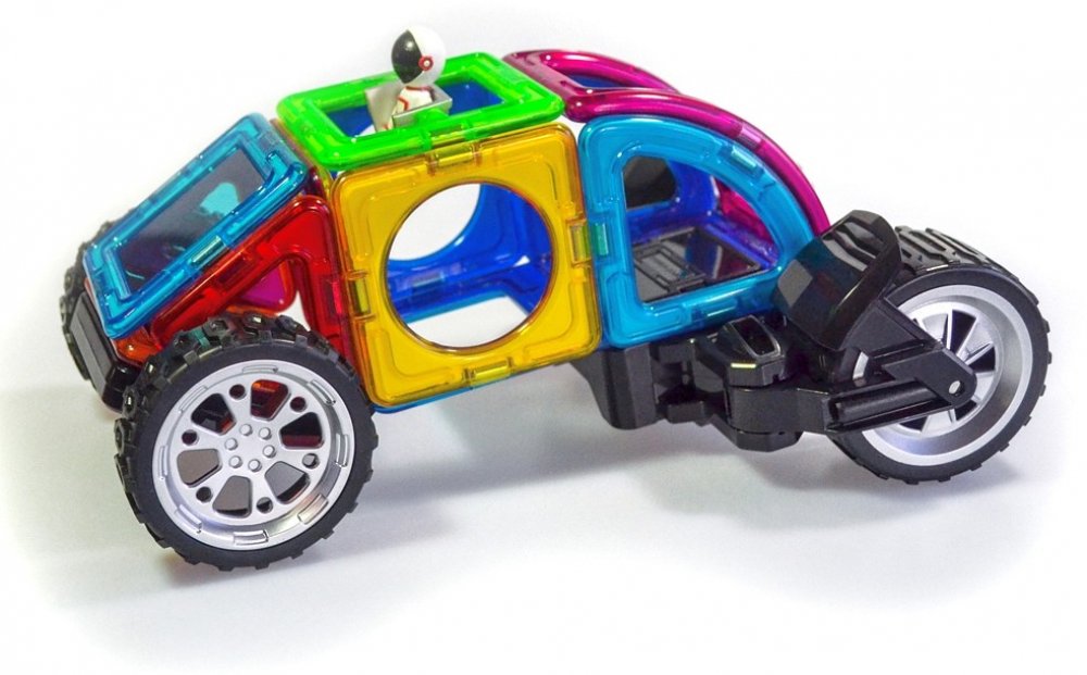 Stavebnice je určená pro stavění nadupaných motocyklů, aut i čtyřkolek a navíc je uložena do boxu. Sada je kombinována ze 3 druhů čtverců a 1 speciálního podvozku transform koleček a 1 standardního podvozku koleček. Transform kolečka jsou obdařeny masivními koly, která lze nezávisle na sobě natáčet až o 90°, takže je využijete pro modelování jednostopých i dvoustopých vozidel. Druhý podvozek je již klasická náprava s 2 propojenými koly. V kombinaci s jakýmikoliv dalšími dílky Magformers pestrost i velikost vozidel násobně narůstá. Většina ze stovek postavených aut a motorek z této stavebnice je i překvapivě odolná a lze je tudíž směle využívat i jako funkční hračku.