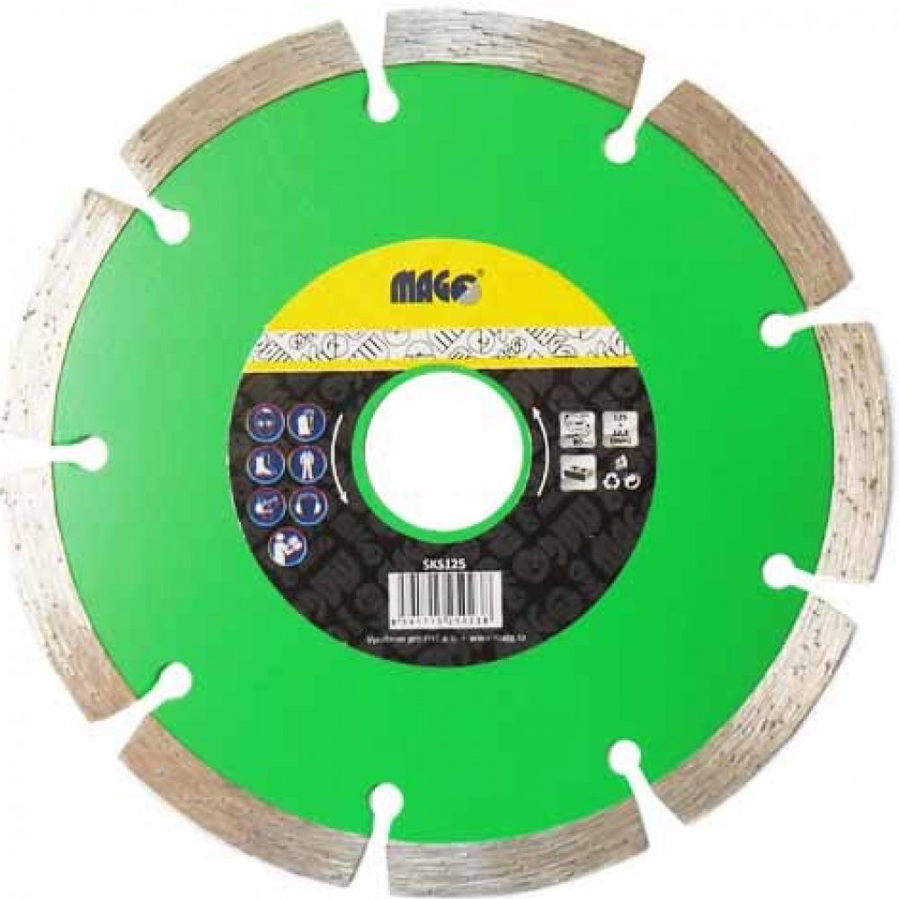 SKS125 Dostupné: 6 ks Popis: Diamantový segmentový kotouč průměr 125mm, průměr středícího otvoru 22,2mm, obvodová rychlost 80m/s, pro řezání úhlovou bruskou. Segmentové provedení zaručí rychlý řez avšak je nutno počítat s mírnými otřepy. Jedná se o kotouč střední kvality, který řeže mnoho stavebních materiálů, s vyločením několika málo druhů, pro které se nehodí. Oproti tomu jak je univerzální, má velice příznivou pořizovací cenu. Doporučeno pro beton, zámkové dlažby, střešní pálené a betonové tašky, pískovec. Možno použít lehké stavební hmoty, omítky, zdivo, porobeton, cihly, vnitřní a vnější keramické obklady a dlažby, s vyloučení slinutých.