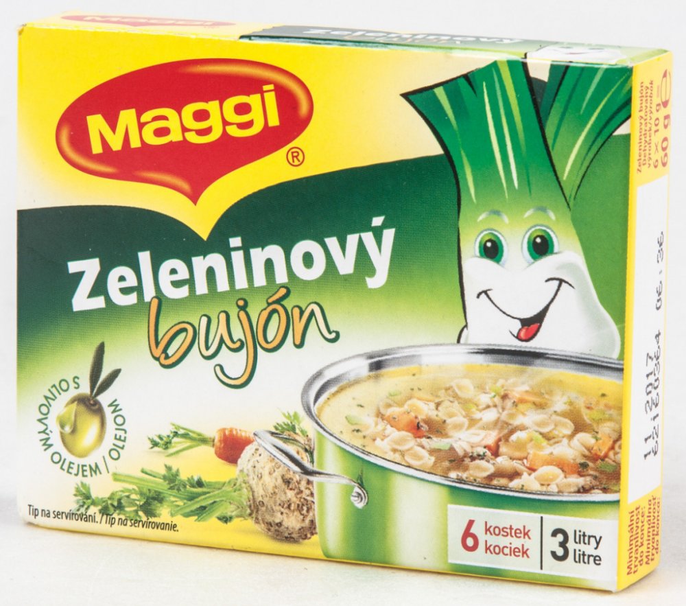 S olivovým olejem, MAGGI Zlatý zeleninový bujón.Dehydratovaný výrobek.Univerzální bujón v kostce. Výrobek je určen k přípravě lahodného bujónu nebo také k dochucení různých zeleninových pokrmů. Velice dobře se dá použít také pro dochucení rýže, těstovin a podobně. Nově obsahuje olivový olej "extra virgin"., www.facebook.com/MaggiCZSKwww.maggi.czwww.nestle.cz, Zeleninový bujón. Dehydratovaný výrobe...