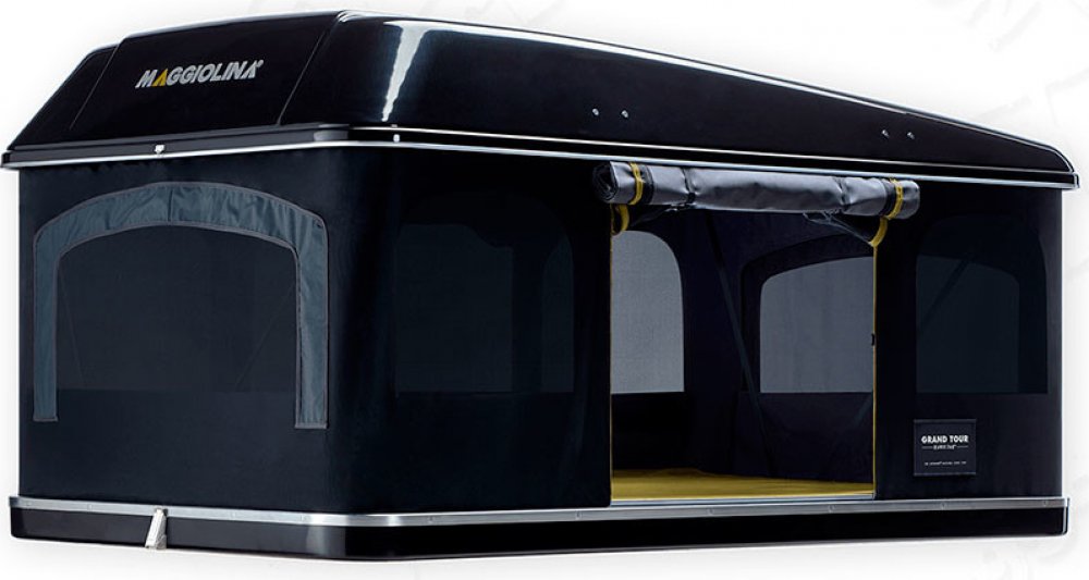 Střešní stan MAGGIOLINA GRAND TOUR 360° LARGE s černou skořepinou, barvou látky carbon (černá), délkou 230 cm, šířkou 160 cm (large) a výškou 115 cm (otevřený) / 36 cm (zavřený). Autostan Maggiolina GRAND TOUR 360° je oproti standardní variantě vybaven navíc čtyřmi okny v rozích stanu. Je vyroben z kvalitních, odolných a funkčních materiálů. Vnitřní prostor pro uložení lůžkovin a osobních potřeb a...