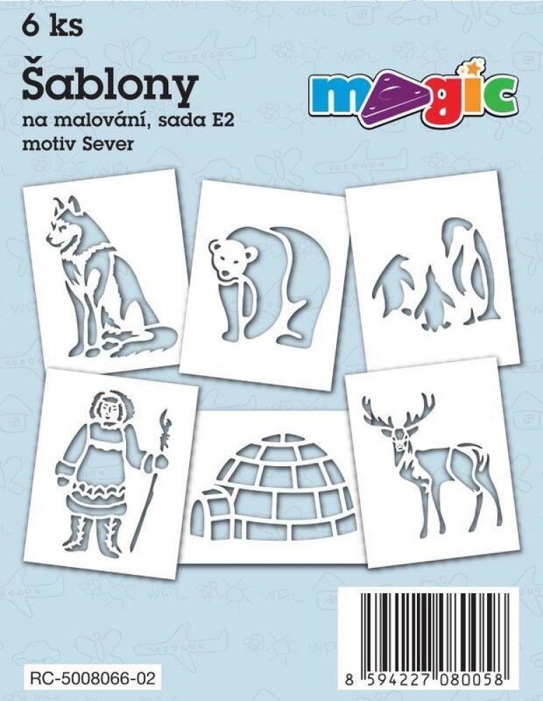 Papírové šablony MAGIC, 11x14cm, 6ks, sada E2 – SEVER Sada papírových šablon na malování, 6ks. Rozměr 11x14 cm. Materiál bílý karton o gramáži 220 g/m2. Vhodné na všechny kreativní techniky - pro malování s magickými voskovkami (technika frotáž), i pro tupování s temperami, pro malování s foukacími fixami nebo techniku malování plastelínou.