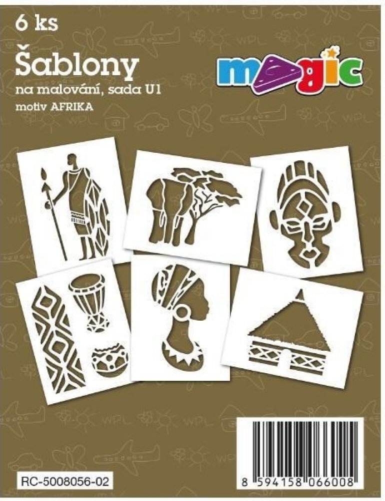 Papírové šablony MAGIC sada U1 – AFRIKA Sada 6 ks papírové šablony na malování. Materiál bílý karton 220g/m2. Doporučujeme pro malování s magickými voskovkami (technika frotáž), vhodné i pro tupování s temperami, pro malování s foukacími fixami nebo techniku malování plastelínou. Nevhodné pro děti do 3.let, obsahuje malé dílky. Rozměry 11x14cm.