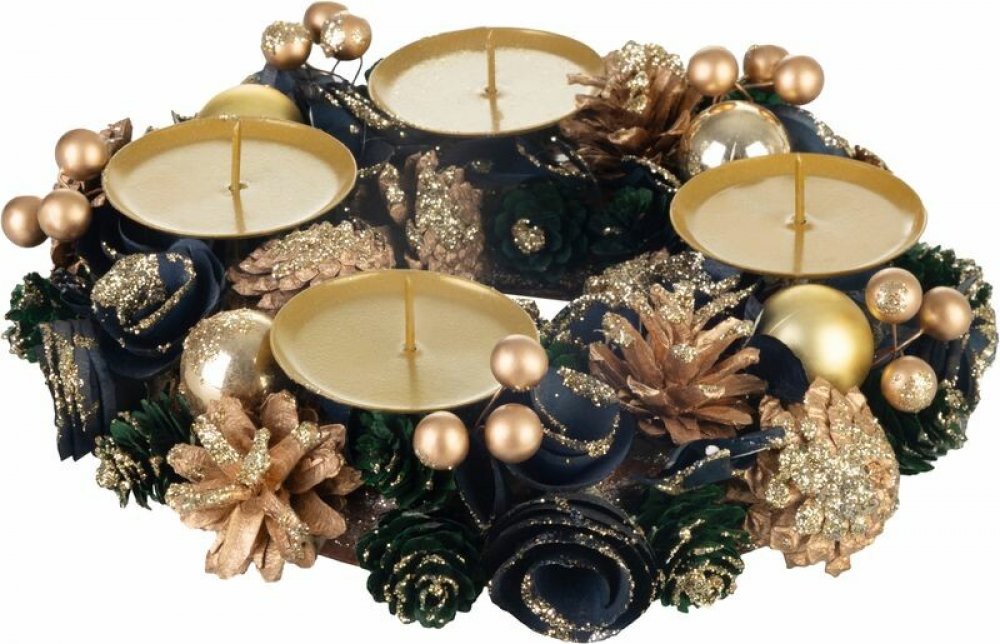 harmonická kombinace: Adventní věnec v zeleno-modro-zlatých tónech, který evokuje lesk a eleganci Vánocrozměry: S průměrem 25 cm je kompaktní a ideální pro menší prostory nebo jako doplněk k jiným dekoracímbarevná paleta: Kombinace zelené, modré a zlaté vytváří bohatý a luxusní vzhled, který upoutá pozornostsváteční akcent: Perfektní k vytvoření slavnostní atmosféry a odpočítávání dní do Vánoc s elegancí