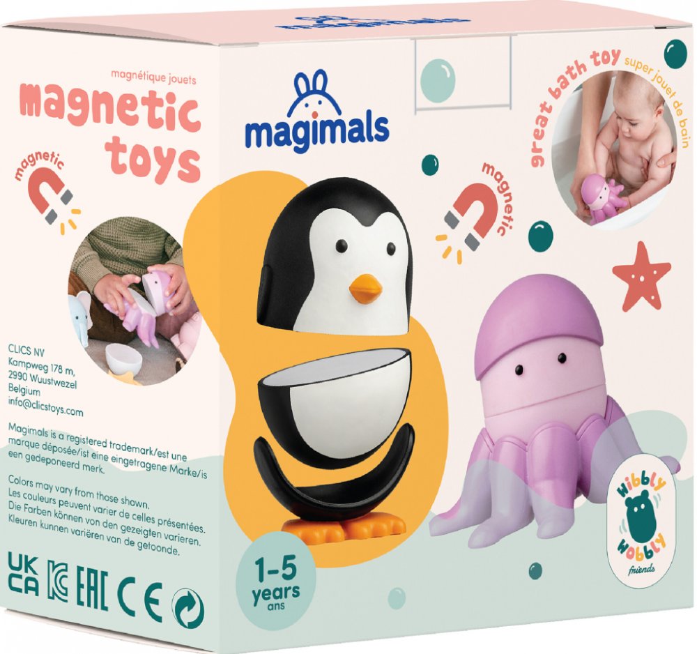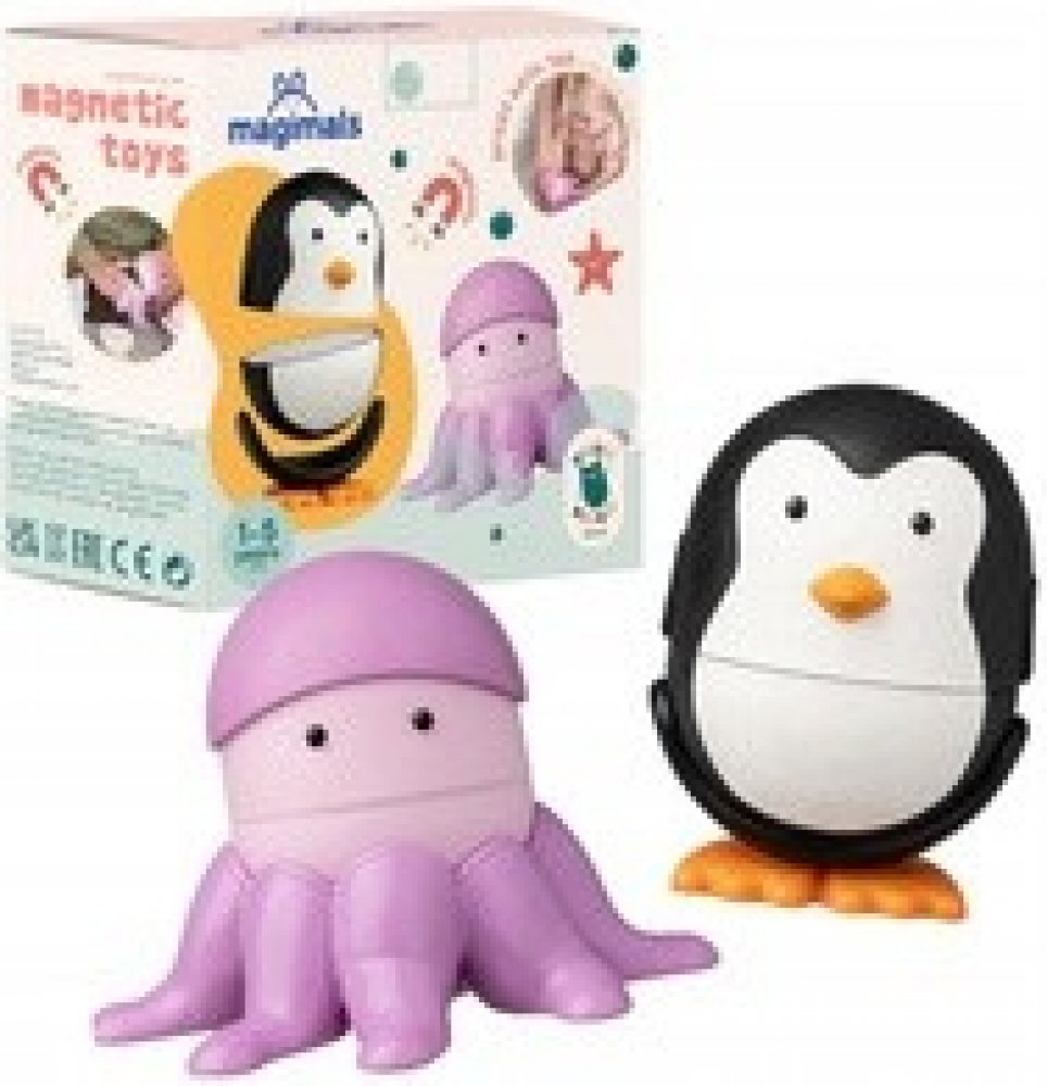 Skládací magnetická zvířátka MořeInteraktivní hračka Magimals pro batolataSkládací magnetická zvířátka Moře Magimals zabaví děti od 1 roku věku. Balení obsahuje dvě roztomilá zvířátka spojená s mořem: tučňáka a chobotnici. Každé zvířátko se skládá ze tří částí: nohou, těla a hlavy z měkkého materiálu. Těchto šest částí lze navzájem kombinovat, což prodlužuje hru a soustředění dětí. Zvířátka se snadno skládají díky silným a bezpečným magnetům a lze je také mačkat a kousat. Děti mohou sestavené zvířátko použít také jako zábavnou houpací hračku, která se nikdy nepřevrátí, nebo jako měkkou hračku do vany.Roztomilá vzdělávací hračka do ložnice i do vanyDíky magnetické skládačce Magimals More se děti stanou malými průzkumníky. Figurky stimulují představivost a podporují kognitivní vývoj. Jsou ideální pro procvičování hmatu, úchopu a logického myšlení. Budou kreativně kombinovat a objevovat svět zvířat. Magimals jsou jedinečné kreativní hračky pro batolata, vyrobené z měkkého, bezpečného, netoxického a omyvatelného materiálu, který je odolný vůči dětským zubům. Magnetická skládačka je vhodná jako dárek k 1. narozeninám.