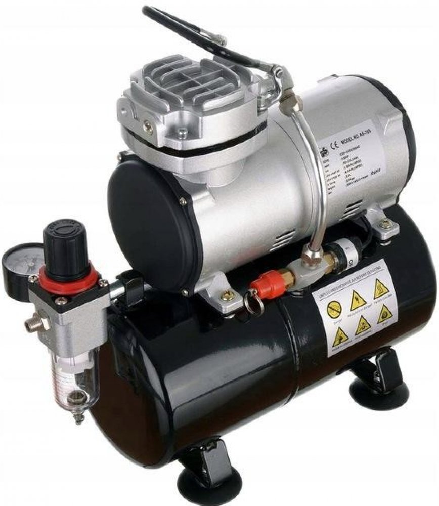 PRÁCE - kompresor pracuje s airbrushes s tryskami od 0,2 do 0,8 mm. Díky vysokému výkonu a konstrukci s válcovým válcem (chlazení). Láhev stabilizuje vzduch (bez pulzace)