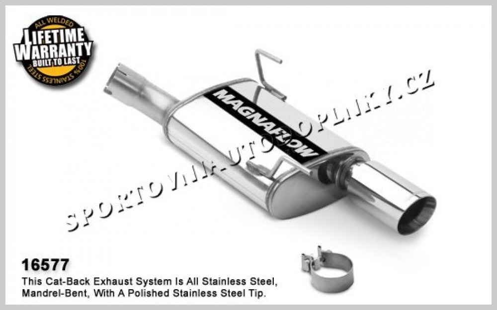 Sportovní výfukové systémy kultovní americké firmy Magnaflow patří spolu s Borlou mezi absolutní špičku ve výrobě sportovních výfuků hlavně v USA. Sportovní konstrukce v nerez provedení s leštěnými koncovkami je přesně stavěna pro daný model auta pro maximální možné navýšení výkonu. Přední úpravci často volí tuto značku jako záruku vysoké kvality, funkčnosti i nádherného zvuku. Naše firma je přímo autorizovaným prodejcem těchto výfuků pro ČR a proto vám můžeme poskytnout plnou záruku a maximální pomoc při výběru správného výfuku,  Některé výfuky držíme přímo skladem a je možné je vidět na naší prodejně v Ostravě. Pokud daný výfuk je skladem v Evropě, u nás jej máme do 10 dnů, pokud je výfuk jen v USA, doba dodání kontejnerem je 2-3 měsíce, letecky 10-14 dnů s  přirážkou od 6000,- Kč bez DPH podle velikosti a váhy výfuku. Nahoře vedle hlavní fotky najdete v souborech často montážní listy, fotky i videa daného modelu auta.
