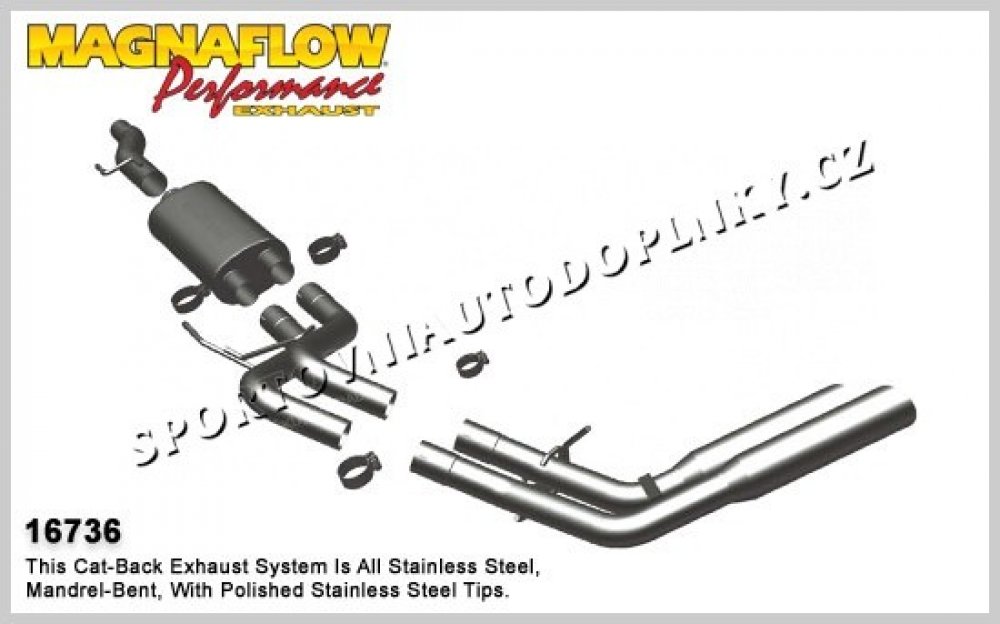 Sportovní výfukové systémy kultovní americké firmy Magnaflow patří spolu s Borlou mezi absolutní špičku ve výrobě sportovních výfuků hlavně v USA. Sportovní konstrukce v nerez provedení s leštěnými koncovkami je přesně stavěna pro daný model auta pro maximální možné navýšení výkonu. Přední úpravci často volí tuto značku jako záruku vysoké kvality, funkčnosti i nádherného zvuku. Naše firma je přímo autorizovaným prodejcem těchto výfuků pro ČR a proto vám můžeme poskytnout plnou záruku a maximální pomoc při výběru správného výfuku,  Některé výfuky držíme přímo skladem a je možné je vidět na naší prodejně v Ostravě. Pokud daný výfuk je skladem v Evropě, u nás jej máme do 10 dnů, pokud je výfuk jen v USA, doba dodání kontejnerem je 2-3 měsíce, letecky 10-14 dnů s  přirážkou od 6000,- Kč bez DPH podle velikosti a váhy výfuku. Nahoře vedle hlavní fotky najdete v souborech často montážní listy, fotky i videa daného modelu auta.
