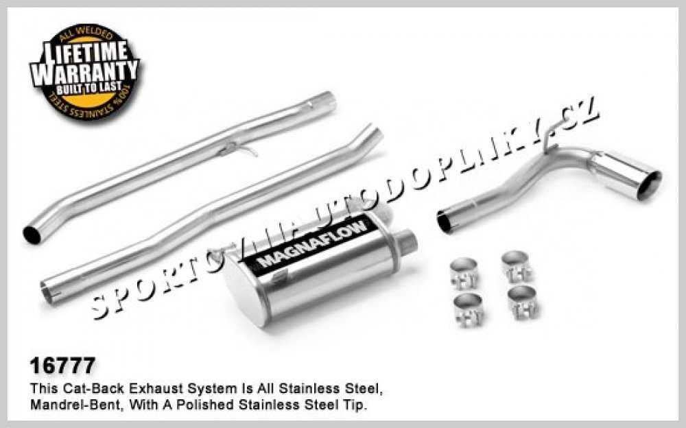 Sportovní výfukové systémy kultovní americké firmy Magnaflow patří spolu s Borlou mezi absolutní špičku ve výrobě sportovních výfuků hlavně v USA. Sportovní konstrukce v nerez provedení s leštěnými koncovkami je přesně stavěna pro daný model auta pro maximální možné navýšení výkonu. Přední úpravci často volí tuto značku jako záruku vysoké kvality, funkčnosti i nádherného zvuku. Naše firma je přímo autorizovaným prodejcem těchto výfuků pro ČR a proto vám můžeme poskytnout plnou záruku a maximální pomoc při výběru správného výfuku,  Některé výfuky držíme přímo skladem a je možné je vidět na naší prodejně v Ostravě. Pokud daný výfuk je skladem v Evropě, u nás jej máme do 10 dnů, pokud je výfuk jen v USA, doba dodání kontejnerem je 2-3 měsíce, letecky 10-14 dnů s  přirážkou od 6000,- Kč bez DPH podle velikosti a váhy výfuku. Nahoře vedle hlavní fotky najdete v souborech často montážní listy, fotky i videa daného modelu auta.