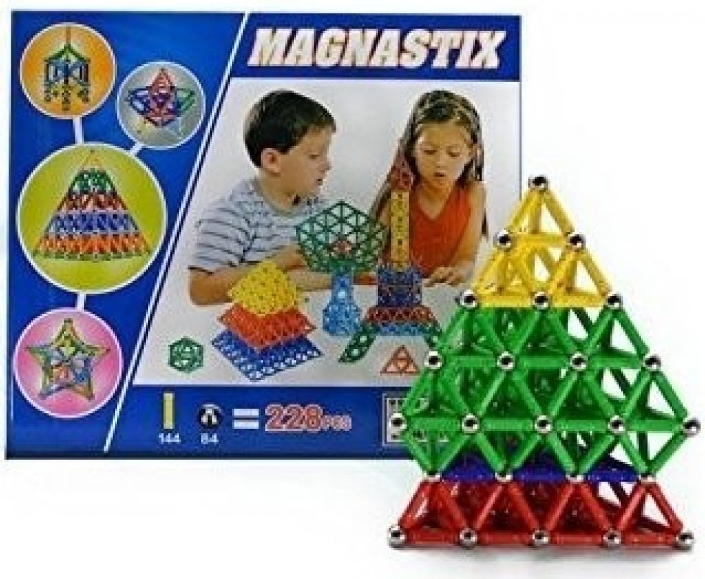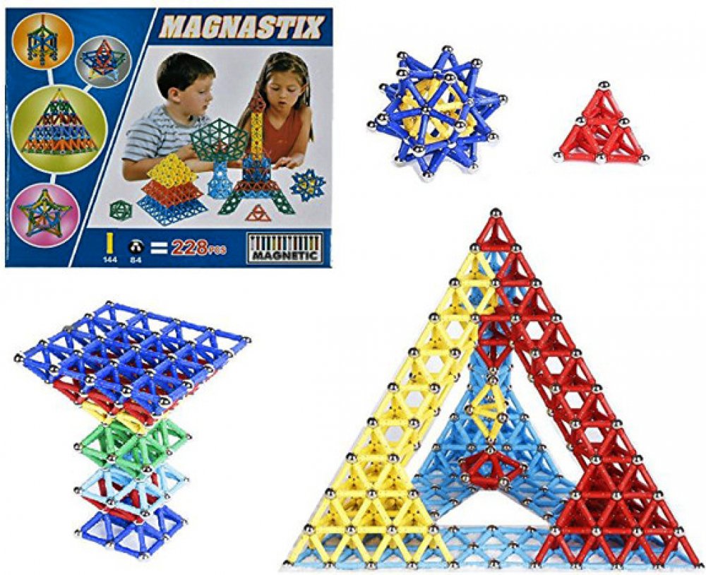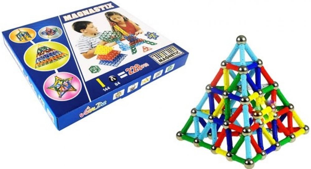 Magnetická stavebnice Magnastix 228 dílů Magnetická stavebnice Magnastix 228 dílků. Tato stavebnice rozvíjí tvůrčí myšlení dítěte. Pomocí stavebnice lze postavit cokoliv, záleží pouze na fantazii Vašich dětí. Stavebnice je velmi podobná známemu Geomagu a je s těmito stavebnicemi kompatibilní. Výrobce garantuje velmi silné magnety uvnitř tyčinek. Určeno pro děti od 5-ti let. Obsahuje: 144 barevných tyčinek o délce 2,5cm 84 kuliček o průměru 1cm