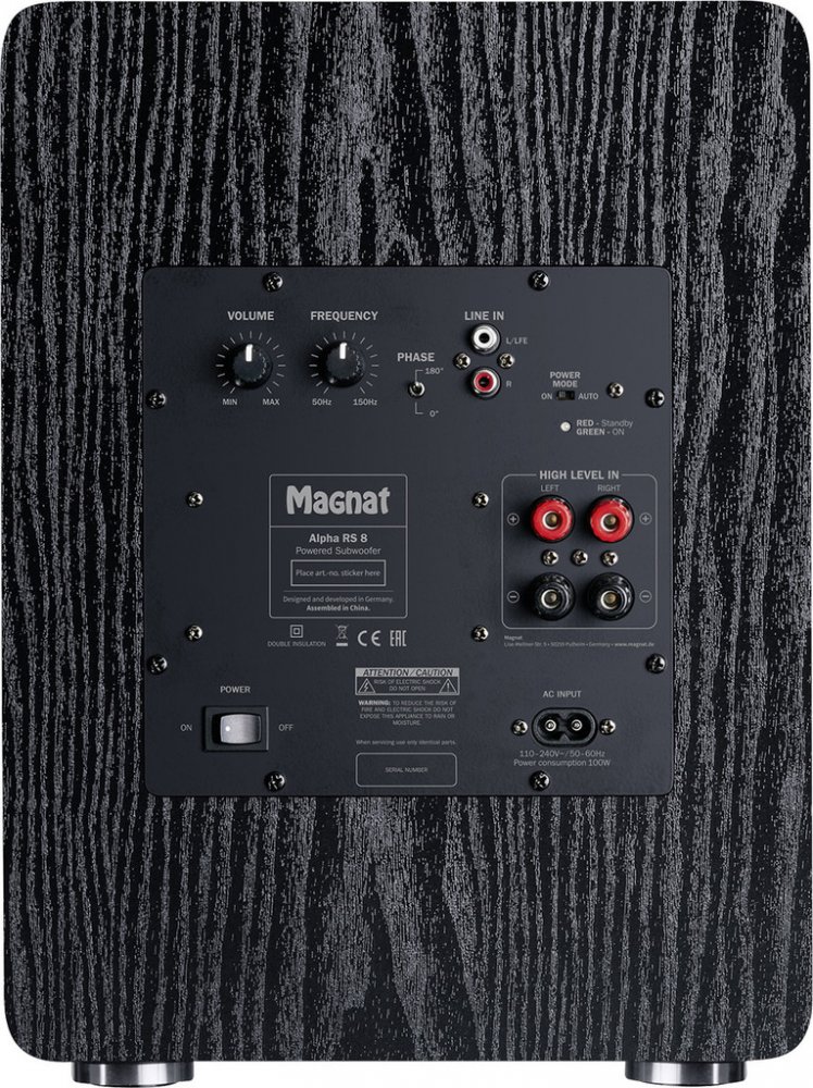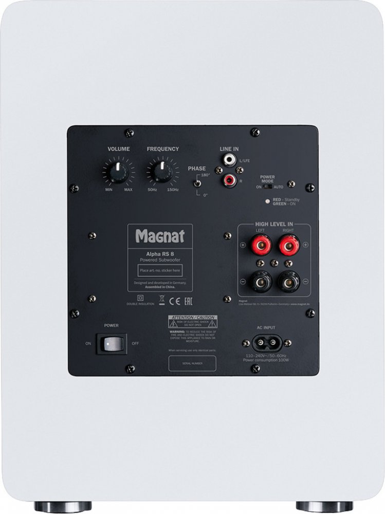 Magnat Alpha RS 8 je vybaven 200 mm vysoce výkonným basovým reproduktorem v basreflexovém krytu, který je vybaven dvěma Airflex porty. Integrovaný zesilovač třídy D poskytuje nepřetržitý výkon 80 wattů, zatímco špičkový výkon je působivých 160 wattů. Technologie zabudovaná do RS8 umožňuje reprodukovat frekvence až do 25 Hz. Elektronika zesilovače umožňuje regulaci hlasitosti, dělicí frekvence a fáze, což umožňuje optimální přizpůsobení akustice místnosti.