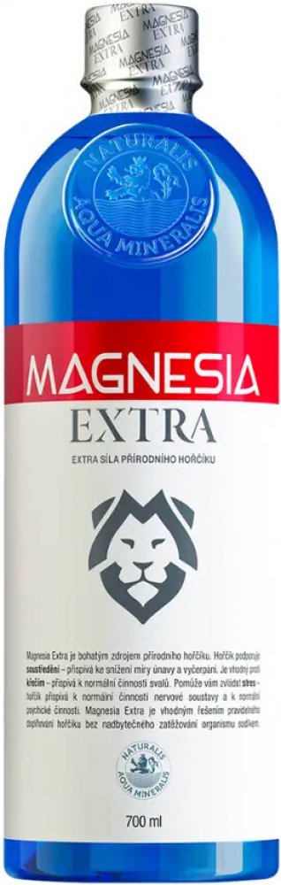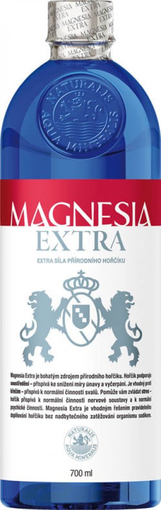 ZÁKONNÝ NÁZEV POTRAVINYMagnesia Extra 0,7lSLOŽENÍVýtěžek z přírodního léčivého zdroje. Silně mineralizovaná voda, hydrogenuhličitano-hořečnatého typu, uhličitá, se zvýšeným obsahem kyseliny křemičité, hypotonická.ALERGENYNeuvádí se, MŮŽE OBSAHOVAT: Neuvádí seVÝŽIVOVÉ ÚDAJE/JEDNOTKAVýživové hodnotyVýtah z analýzyKationty (mg/l) Na? 5,3 Ca?? 50,2 Mg?? 312* Anionty (mg/l) HCO?? 1726 SO??? 14,