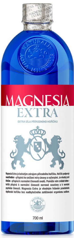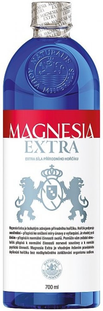 Magnesia Extra je bohatým zdrojem přírodního hořčíku. Magnesia Extra obsahuje 218 mg hořčíku, což představuje 58 % referenční hodnoty příjmu hořčíku na den. Hořčík je v Magnesii Extra obsažen přirozeně z podzemního zdroje a není do ní nijak přidáván. Obsah sodíku v Magnesii Extra je jen 3,71 mg v 0,7 l (0,53 mg / 100 ml) a Magnesia Extra je tak potravinou s nízkým obsahem sodíku. Magnesia Extra je vhodným řešením pravidelného doplňování hořčíku bez nadbytečného zatěžování organismu sodíkem. Hořčík přispívá k normální činnosti nervové soustavy, svalů a snížení míry únavy a vyčerpání. Objem 0,7 l. Cena za kus.