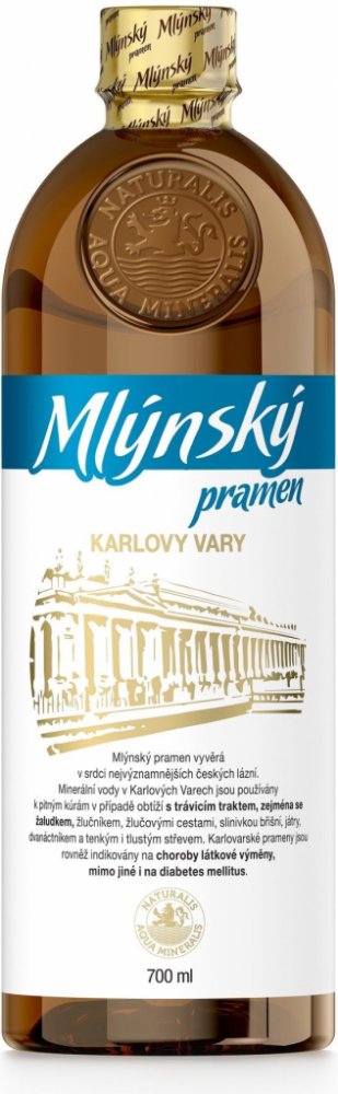 *Tradiční karlovarské prameny byly dlouho dostupné pouze přímo v lázeňském centru Karlových Varů *Nyní po letech se obnovuje tradice stáčení Mlýnského pramene, výtěžku s přírodního léčivého zdroje, do lahví *Bude tak opět spotřebitelům k dispozici kdekoli v České republice *Karlovarské prameny se tradičně používají k pitným kúrám v případě obtíží s trávicím traktem, zejména se žaludkem, žlučníkem, žlučovými cestami, slinivkou břišní, játry, dvanáctníkem a tenkým i tlustým střevem *Rovněž jsou indikovány na choroby látkové výměny mimo jiné i na diabetes mellitus * Objem: 0,7 l *VÁŽENÝ ZÁKAZNÍKU, nakupujete-li tento produkt po více kusech, zohledněte prosím při svých objednávkách počet kusů obsažených v originálním balení (6 ks). Nákupem po originálních baleních nám pomůžete vaši objednávku zpracovat ještě rychleji a kvalitněji. Děkujeme
