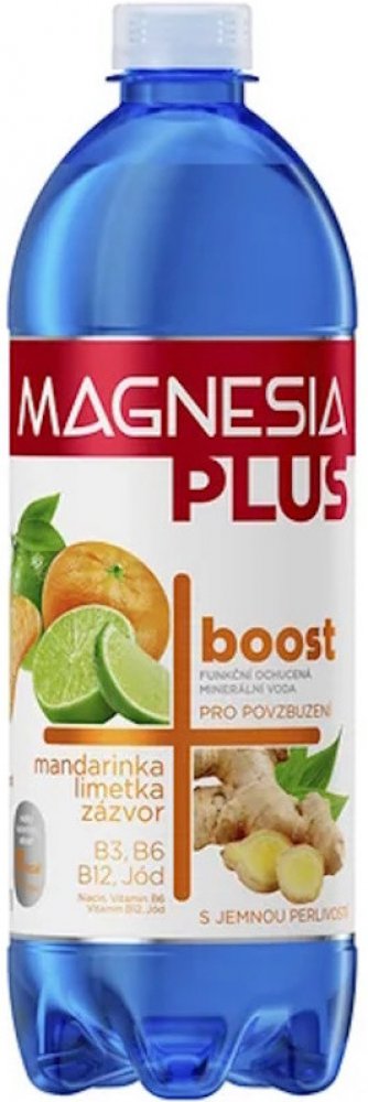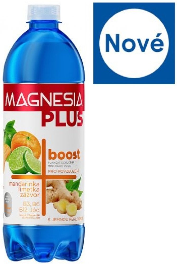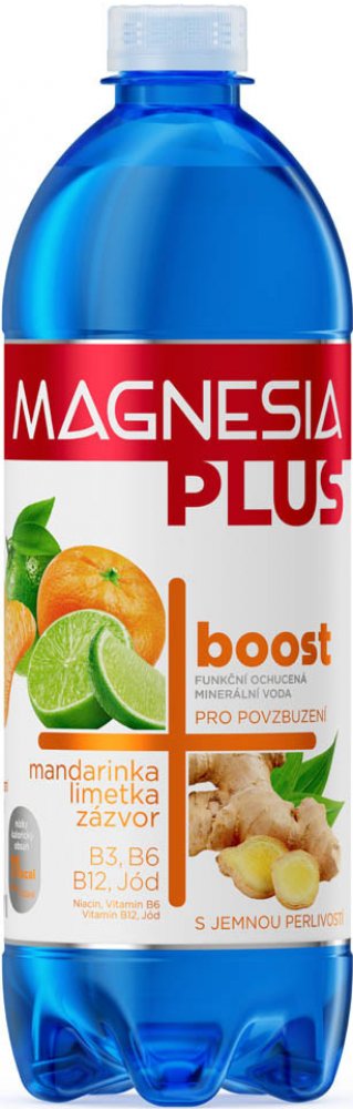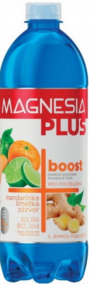 Ochucená minerální voda Magnesia Plus Boost. Obsah 0,7l. Příchuť mandarinka, limetka a zázvor. Potřebujete energii a nechcete sáhnout po energetickém nápoji ani kávě? Pak je tu řešení v podobě Magnesie Plus Boost, která vám díky přidaným vitamínům a jódu pomůže získat potřebnou energii. obsahuje vitaminy a přidané minerály v množství 15 % referenční hodnoty příjmu vytvořena z přírodní minerální vody Magnesia s obsahem hořčíku nízkokalorická a s nízkým obsahem cukru bez konzervantů, umělých barviv a sladidel