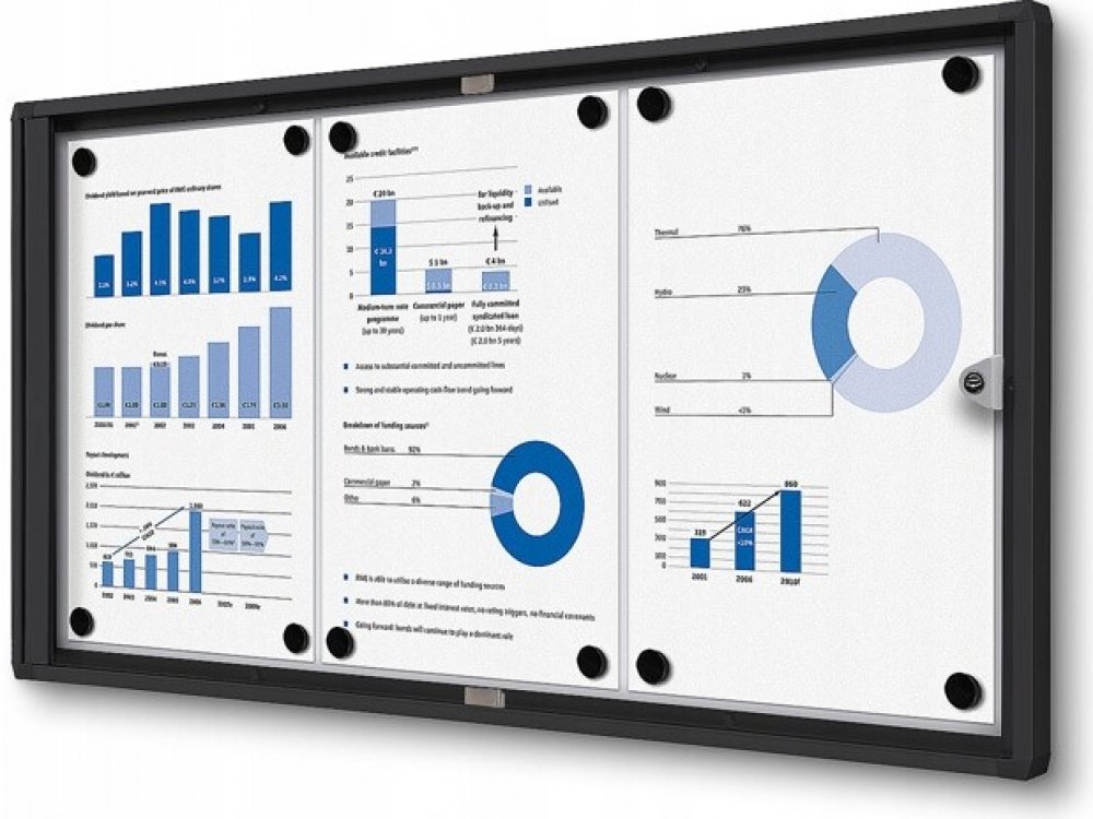 Magnetická informační vitrína uzavíratelná na klíč je vyrobena z eloxovaných hliníkových profilů lakovaných černou barvou. Zadní strana vitríny je vyrobena z práškově lakovaného plechu, díky čemuž je povrch magnetický a umožňuje psaní fixami. Ideální řešení pro schodiště, kanceláře, úřady, školy apod.