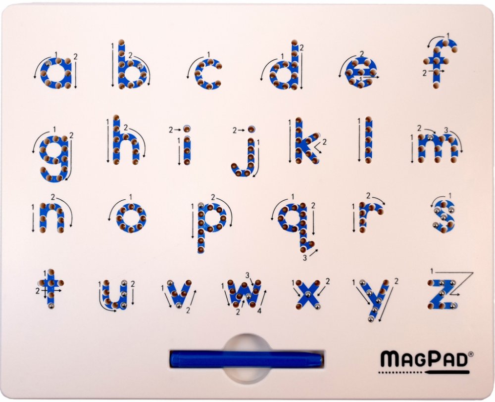 Magnetická tabulka abeceda. Nový nástroj pro výuku psaní písmen vašich dětí. S pomocí této tabulky se může Vaše dítě učit psát malá tiskací písmena abecedy, aniž by chodilo do školy. Tato magnetická tabulka je složená z magnetických kuliček a pera. Dítě pomocí nakreslených šipek obkresluje magnetickým perem linii písmen. Jednoduše prstem můžete mazat a opravovat. Pomocí magnetů, které reagují na pohyb tužky, se vytváří písmena ve správném tvaru a dítě si tak zafixuje správný tvar písmene a zároveň směr psaní. Učení má být zábavné a bezpečené, proto je Magpad navržen tak, aby jeho údržba byla jednoduchá a zároveň bezpečná.