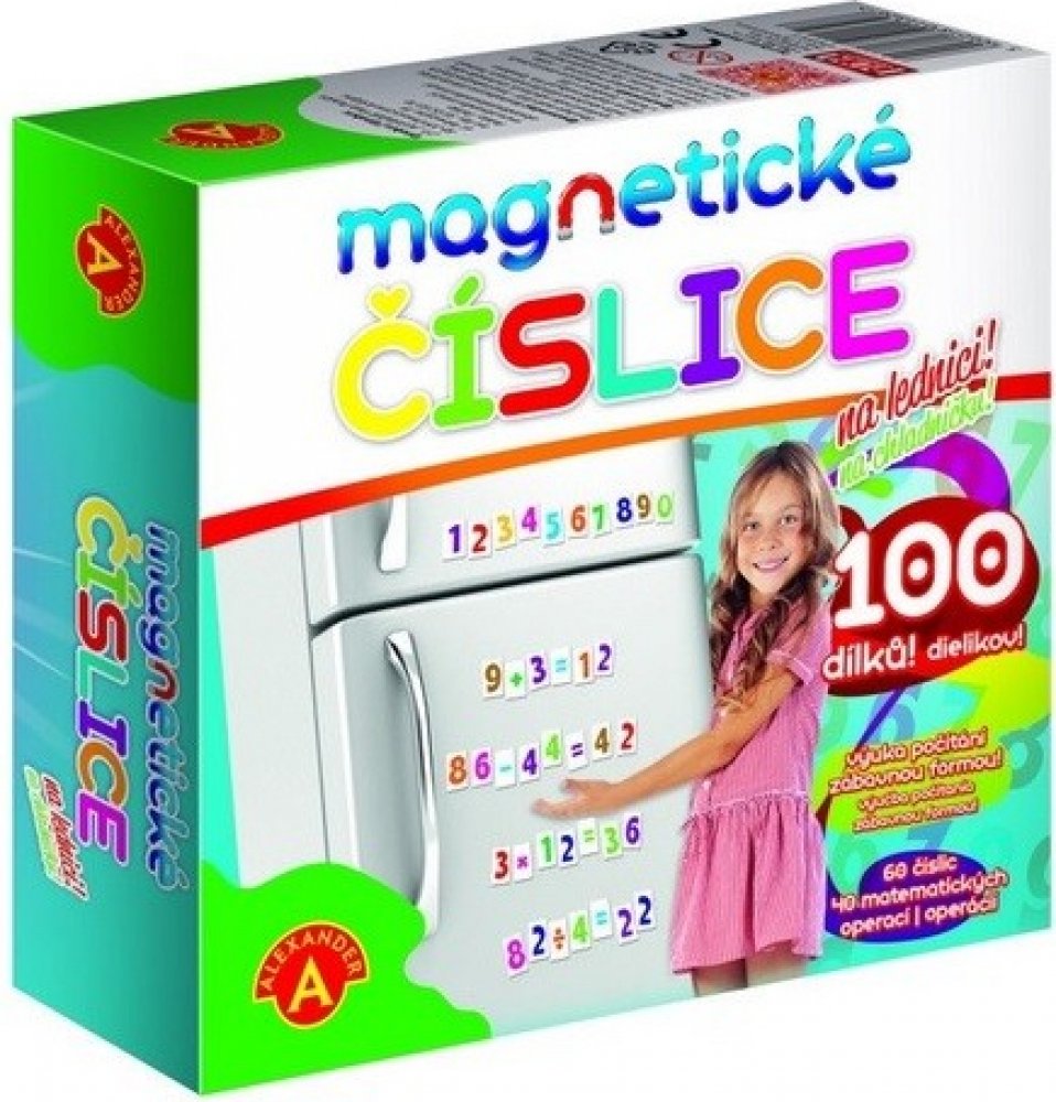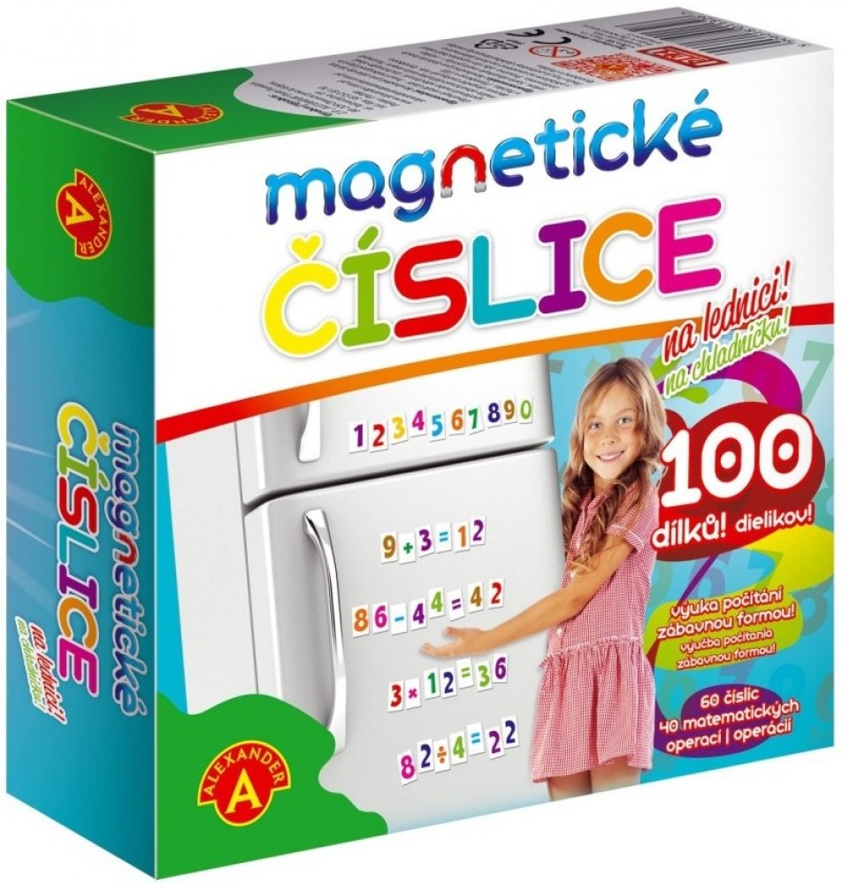 Magnetické číslice se dají připevnit na lednici, pračku, myčku, školní tabuli nebo jakýkoliv jiný kovový povrch. V balení najdete 100 dílků číslic a znaků, s jejich pomocí se děti mohou učit i hrát si zároveň. Balení obsahuje 60 ks číslic a 40 ks různých matematických operací, ze kterých "vykouzlíte" všechny možné kombinace příkladů jako je násobení, dělení, sčítání i odčítání.
