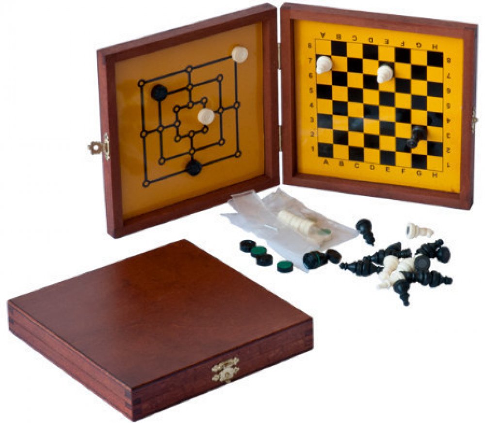 Magnetické dřevěné mini šachy a mlýnek v hnědé barvě, velikost krabičky 13,5 x 13,5 cm, velikost šachovnice 12 x 12 cm, výška krále 2,5 cm. Vhodné na cesty.