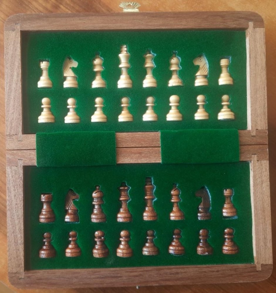 Šachy hra králů.  Material tropické dřevo Vyrobeno v Indii Políčko  19 mm Šachovnice  15x15 cm Velikost krále :  3,2 cm Figurky napevno uloženy
