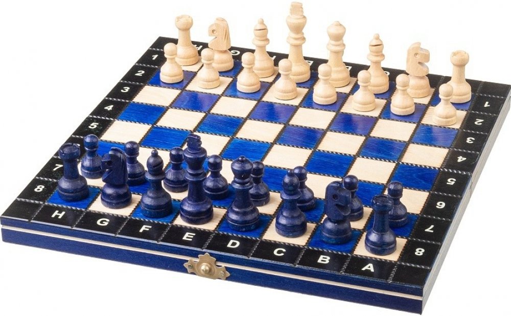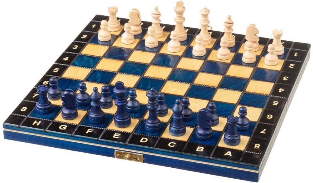 Magnetické dřevěné šachy v modré barvě. Velikost šachovnice 26 x 26 cm, výška krále 5 cm. Úložný prostor a organizér pro figurky uvnitř šachovnice. Klasický Staunton styl figurek, vhodné pro děti a na cesty.