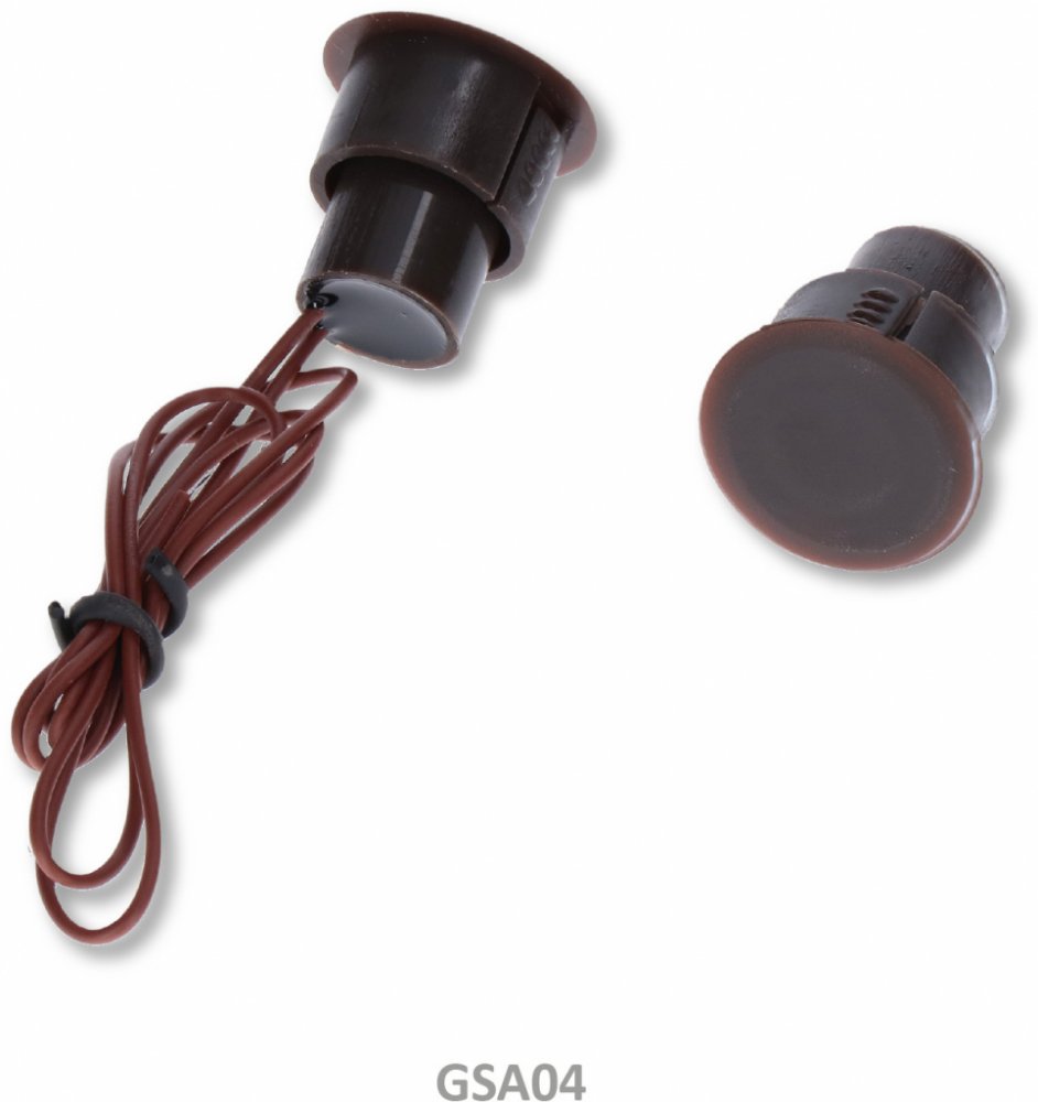 Magnetický spínač (kontakt) válcového tvaru určený pro zapuštění např. do rámu dveří. Vodotěsný.
