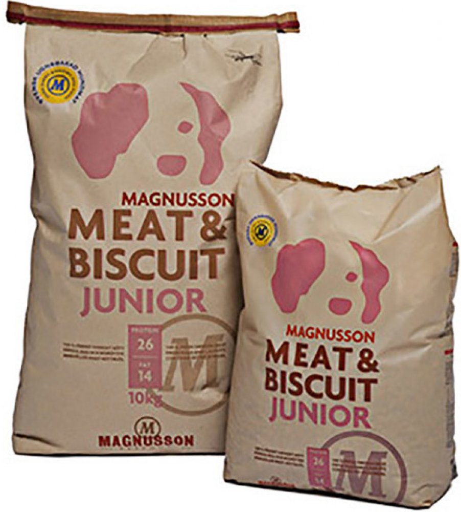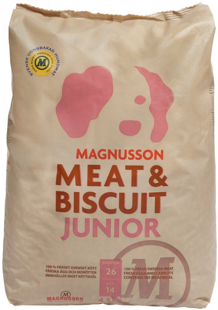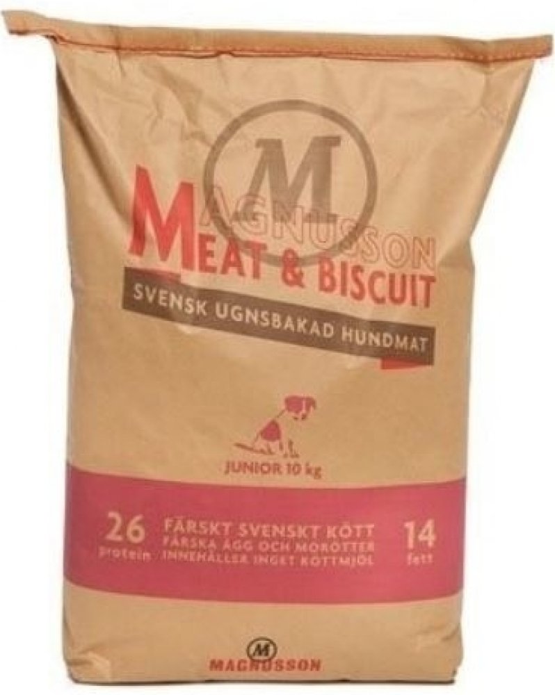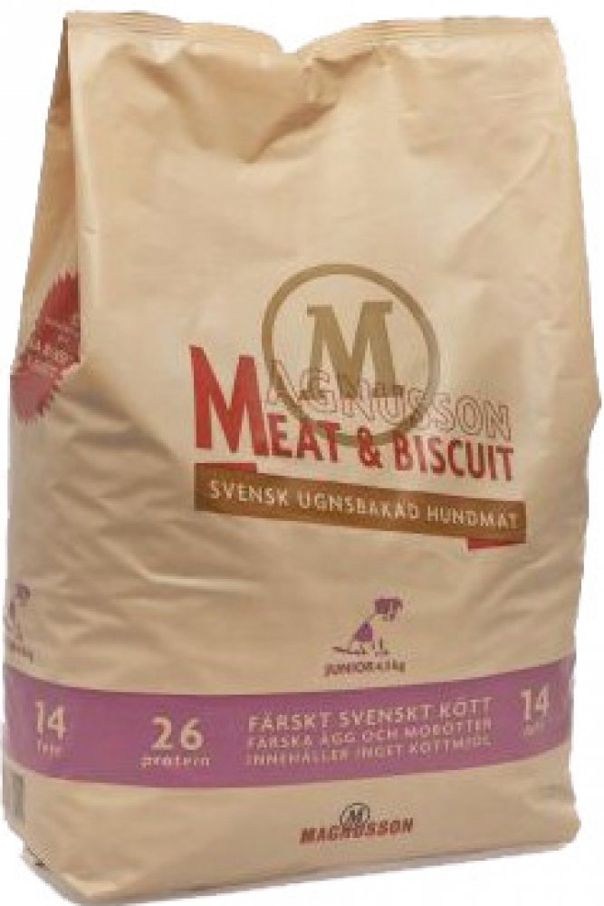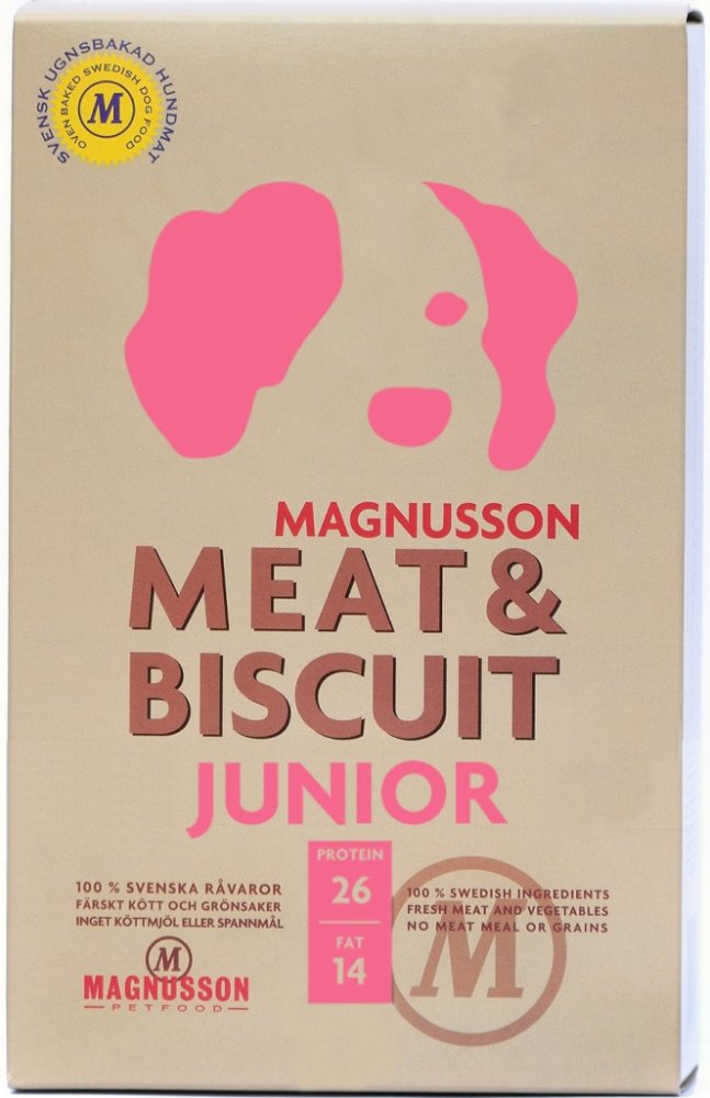MAGNUSSON Meat Biscuit Junior je kompletní krmivo pro štěňata všech plemen. Krmivo Magnusson Junior je vyrobeno ze 100% čerstvého masa a dalších vynikajících čerstvých surovin. Magnusson je první výrobce krmiv pro psy, který dokázal do krmiva dostat 100% podíl čerstvých surovin, pomocí technologie pečením. Magnusson ve svých krmivech využívá pouze regionální švédské suroviny, které jsou pro kvalit...