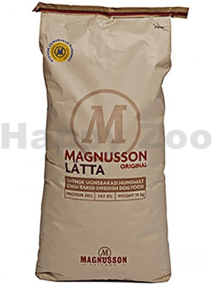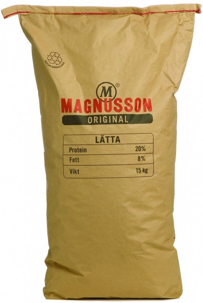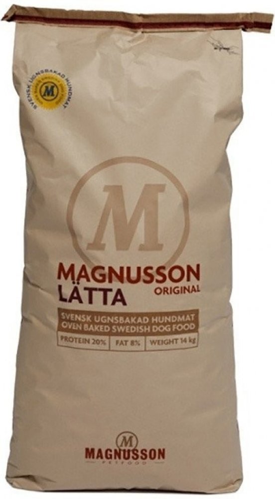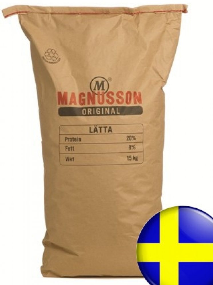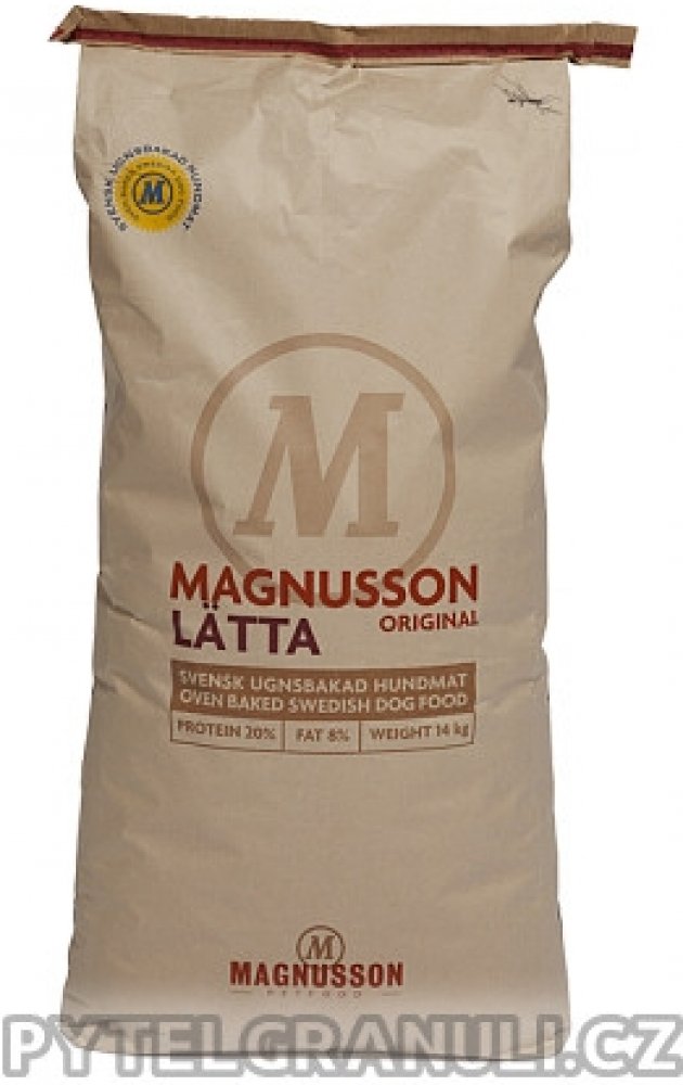 Magnusson Original LÄTTA je kompletní krmivo pro dospělé psy s nízkou aktivitou, které mají tendenci k nadváze. Original Lata je čisté přírodní krmivo, bez zbytečných umělých, chemických látek. Krmivo je vyrobeno z regionálních švédských surovin, které jsou pro kvalitu krmiva zásadní.