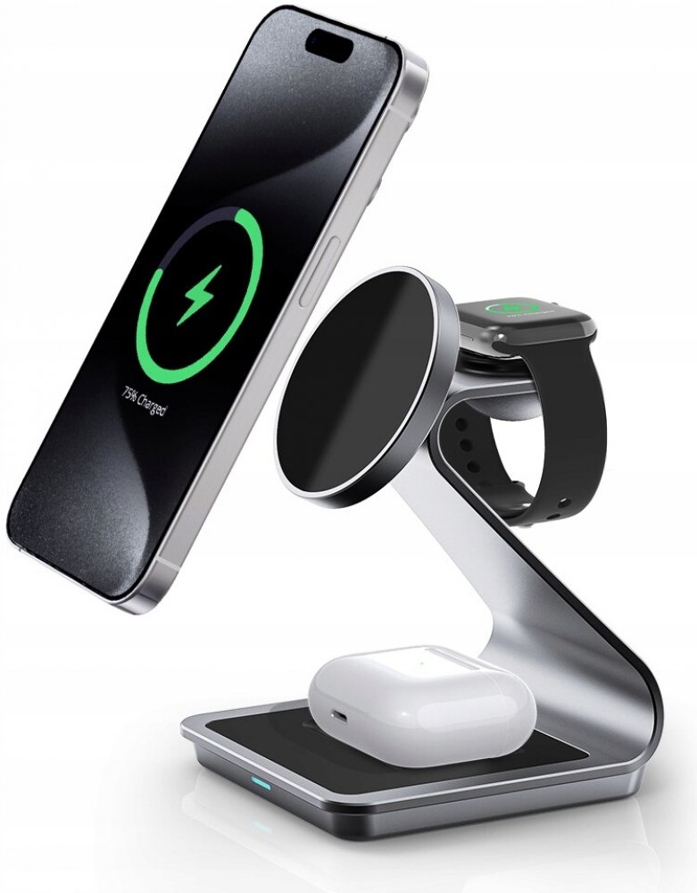 Nabíjí iPhone (MagSafe), AirPods a Apple Watch současně na jednom stojánku. Eliminuje potřebu více kabelů/adaptérů pro čisté a organizované nastavení
