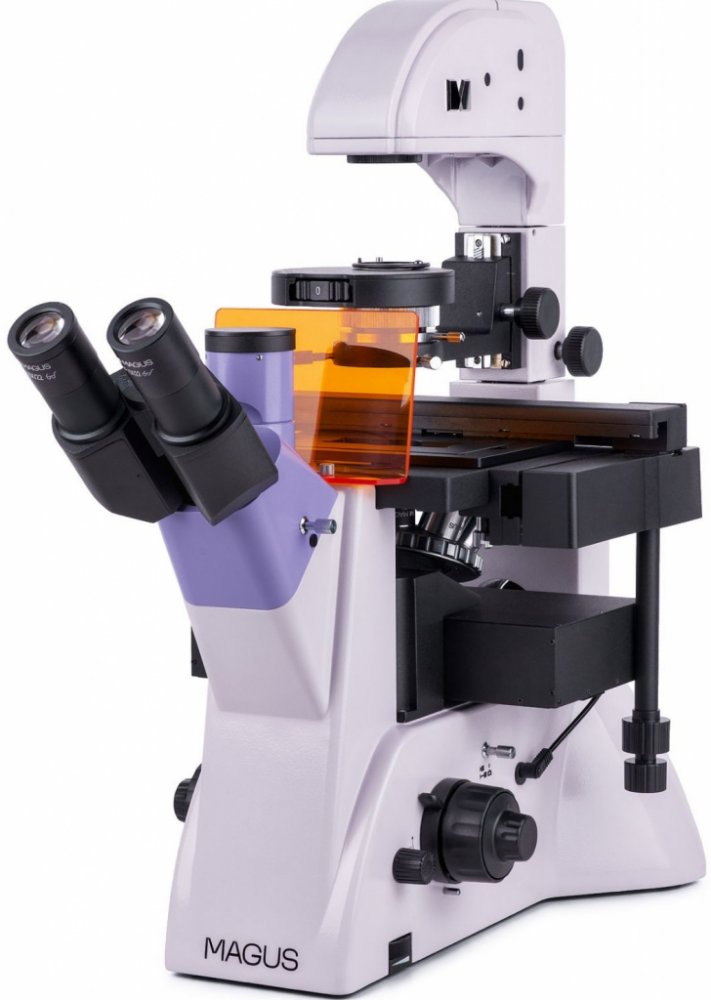 MAGUS Lum V500L je inverzní mikroskop pro fluorescenční mikroskopii v odraženém světle a mikroskopii ve světlém poli a s fázovém kontrastem v procházejícím světle. Pro fluorescenční mikroskopii se používají fluorochromové filtry DAPI, FITC a TRITC. Invertovaná konstrukce umožňuje studium vzorků v laboratorních nádobách, jako jsou Petriho misky, baňky atd. Výška laboratorních nádob může být 55 mm až 165 mm v případě, když je stojan nakloněný. Optický systém je určen pro laboratorní nádoby s tloušťkou dna 1,2 mm. Mikroskop je skvělou volbou pro výzkum i rutinní laboratorní práce a může být použit také pro účely vzdělávání. Optika Dvě možnosti montáže digitálního fotoaparátu a monitoru: na trinokulární tubus se montuje monitor (není součástí dodávky); boční otvor na těle je určen k montáži digitálního fotoaparátu (není součástí dodávky). K dispozici je rozdělovač paprsků: 100/0 nebo 0/100 (na těle) a 100/0 nebo 50/50 (na trinokulární hlavě). Úhel sklonu tubusu okuláru 45° umožňuje pozorování s maximálním komfortem. Při sestavování mikroskopu může uživatel otáčet tubusy okuláru o 180°.