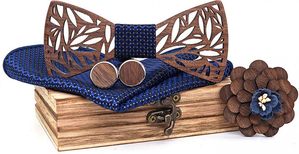 LUXUSNÍ SADA: Dřevěný motýlek 12cm, s kombinací modré látky. Soupravu doplňuje kapesníček 23 x 23 cm ve stejném designu látky použité na střed motýlku. Dřevěné manžetové knoflíčky mají okraj ve stříbrné barvě. Součástí sady je ozdoba do klopy saka. Tento model dodáváme v dárkové krabičce.