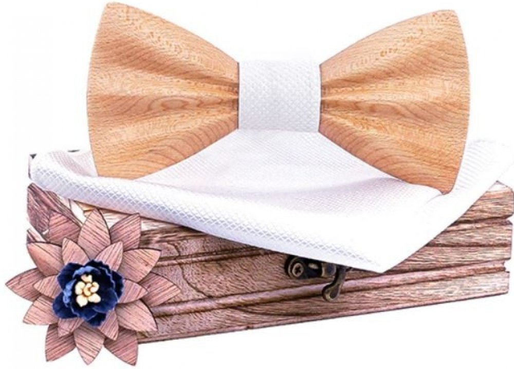 Dřevěný motýlek spolu s kapesníčkem v bílé barvě a broží do klopy se skvěle doplňují. Světlé přírodní dřevo jedinečně doplňuje jemný proužek s kapesníčkem v bílé barvě. Decentní design a přírodní materiál kombinovaný s textilií tvoří luxusní kompozici. Dřevěný motýlek je díky exotickému 100% přírodnímu, dřevěnému materiálu velmi lehký a s pomocí nastavitelného, elastického pásku obepne každý krk. Budete mít jistotu, že se motýlek nikdy nerozváže a neupadne. Dárkové balení, rozšířené o brož a kapesníček ve stejném odstínu jako je středová stuha motýlku, ještě více podtrhne osobitou krásu netradičního módního doplňku.