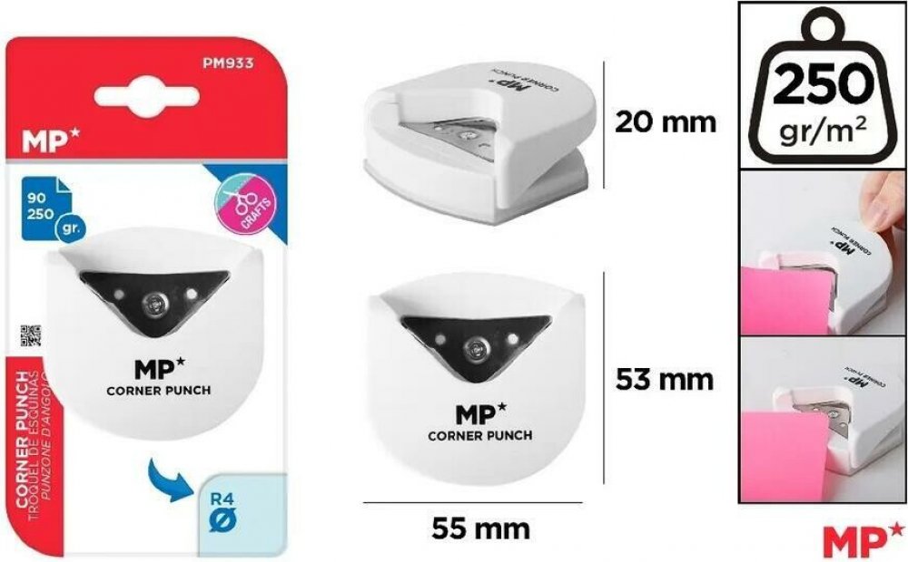 Speciální zaoblovač rohů pro ruční práce. Popis k výrobku: řezačka MP rohy R4 250g PM933Speciální zaoblovač rohů pro ruční práce.Umožňuje zakřivené řezy a zaoblování rohů na papíře, kartonu nebo plastových kartónech.Čepel z nerezové oceli.Rozměr: 52 x 52 x 22 mm