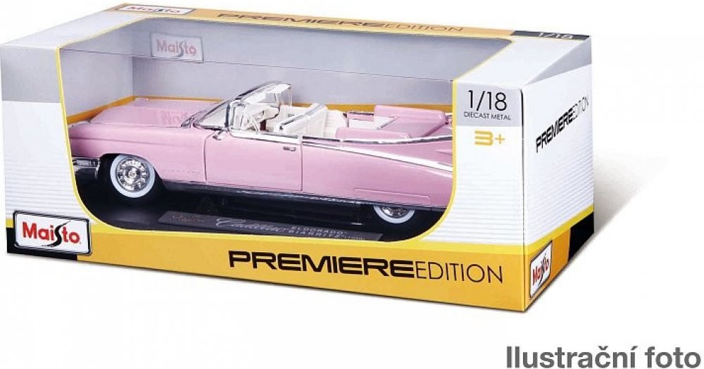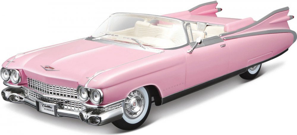 Kovový model auta 1:18 Maisto 36813 Cadillac Eldorado Biarritz 1959 nejen pro sběratele. Model je v detailním provedení na plastovém podstavci. Barva modelu je růžová a je přibližně 27 cm velký.