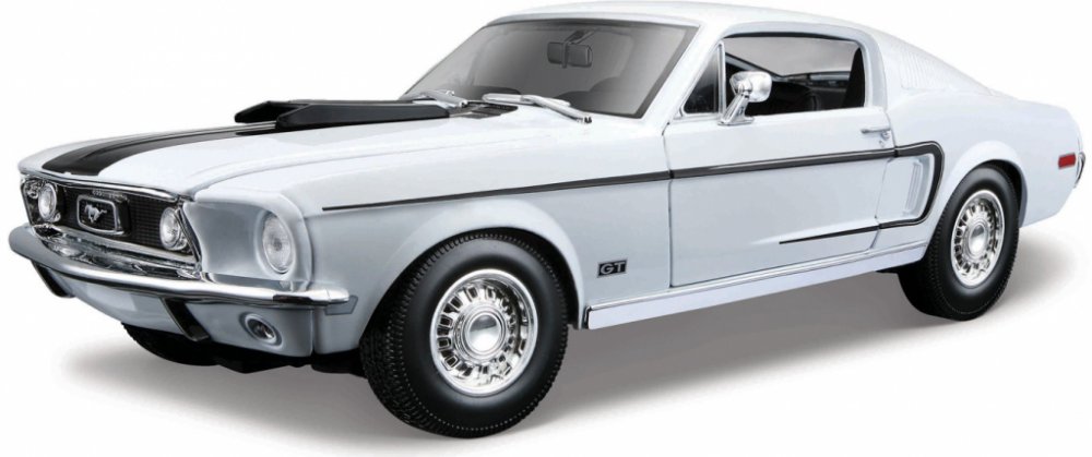 Kovový model auta 1:18 Maisto Ford Mustang GT Cobra Jet 1968 nejen pro sběratele. Model je v detailním provedení na plastovém podstavci. Barva modelu je bílá.