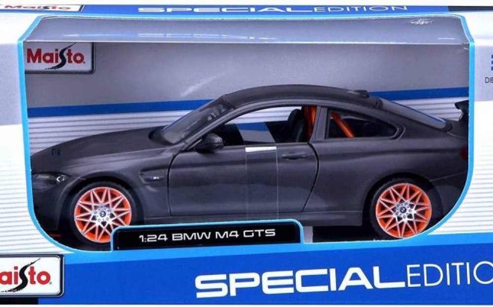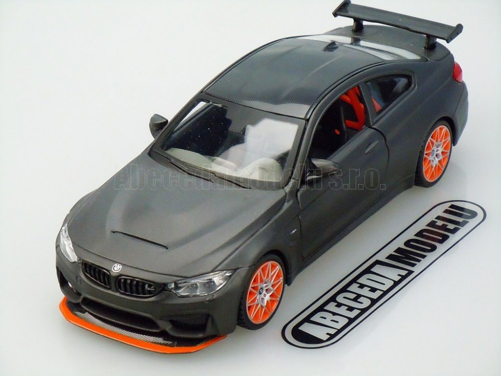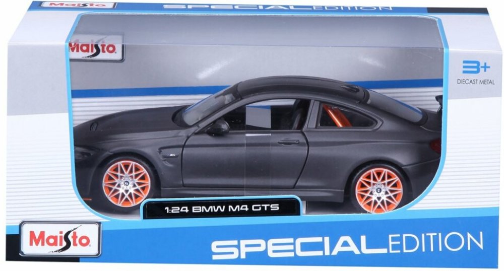 Kovový model auta 1:24 Maisto 31246 BMW M4 GTS nejen pro sběratele. Model je v detailním provedení a má otevíratelné dveře. Barva modelu je matná kovově šedá a je přibližně 18 cm velký.
