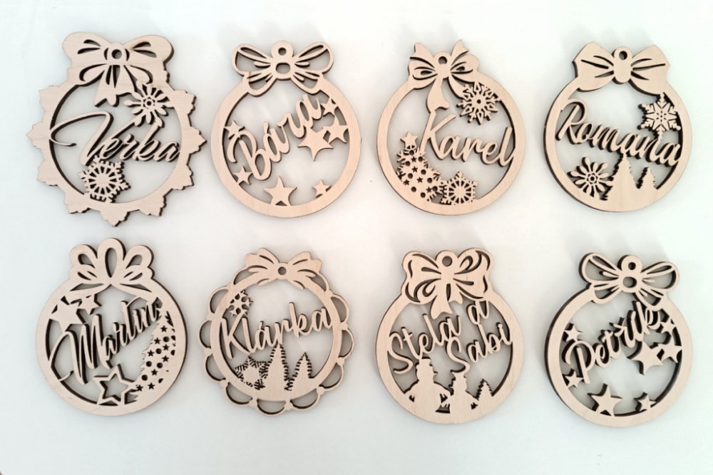 Sada 8 kusů dřevěných, vyřezávaných Vánočních ozdob se JMÉNEM.