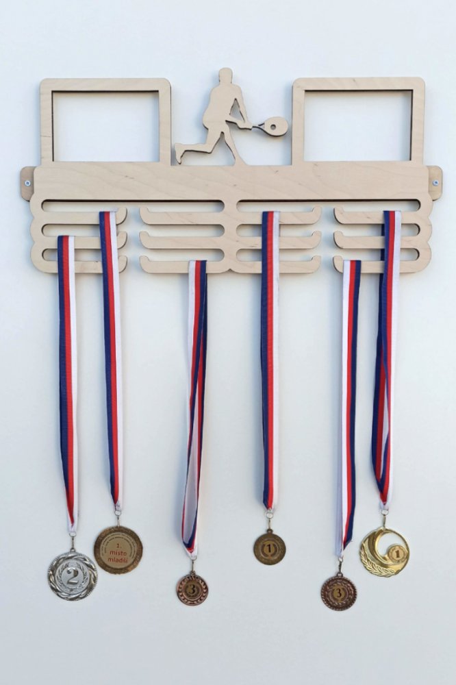 Věšák na medaile se siluetou hráče tenisu. Vyroben z 8 mm překližky s fotorámečky pro 2 ks fotografií o rozměru 15x10 cm.