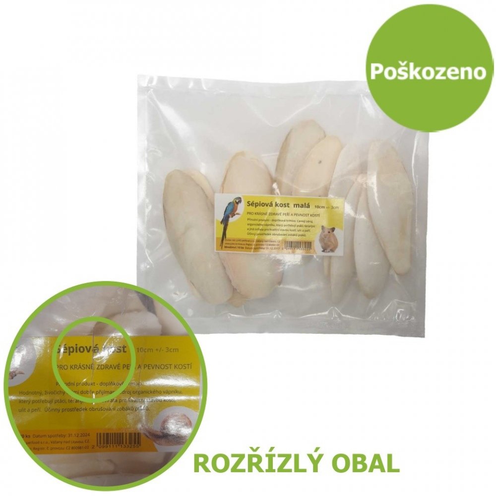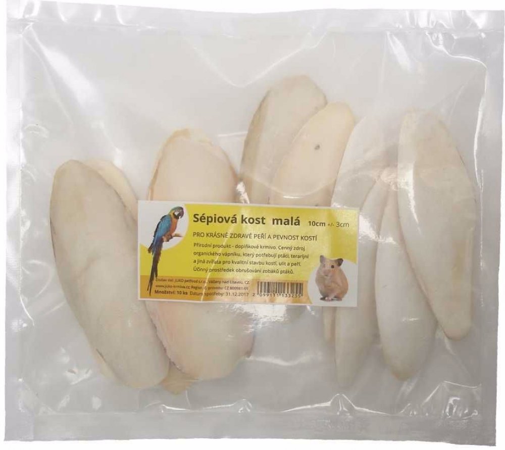 Pravé sépiové kosti nejsou po mechanickém očištění a vysušení čistě bílé. Bělosti sépiových kostí dosahují někteří výrobci použitím velmi silných bělících prostředků. Této cestě se snažíme vyhnout a prodávat jen čistě přírodní produkty a neohrožovat konečné "konzumenty" sépiových kostí zbytkovým obsahem čehokoliv blíže neurčeného, co by jim mohlo uškodit. Zářivě bílé neznamená v případě sépiových kostí kvalitní.Velikost: 10cm (+3 cm)Balení: 20 ks