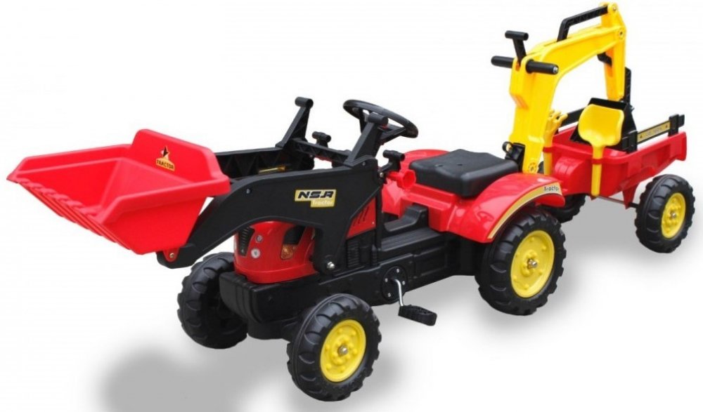 Dětský šlapací traktor s nakládací lžící a přívěsem je určen pro děti od 3 let a hmotnosti 30 kg. Pohon zajištuje řetěz, traktůrek se ovládá pomocí volantu. V přední části je umístěna široká pohyblivá nakládací lžíce v zadní části potom lžíce bagru. Součástí přívěsu jsou hrábě a lopatka na písek. Traktor je vyrobený z plastu a vyznačuje se velmi nízkou hmotností.