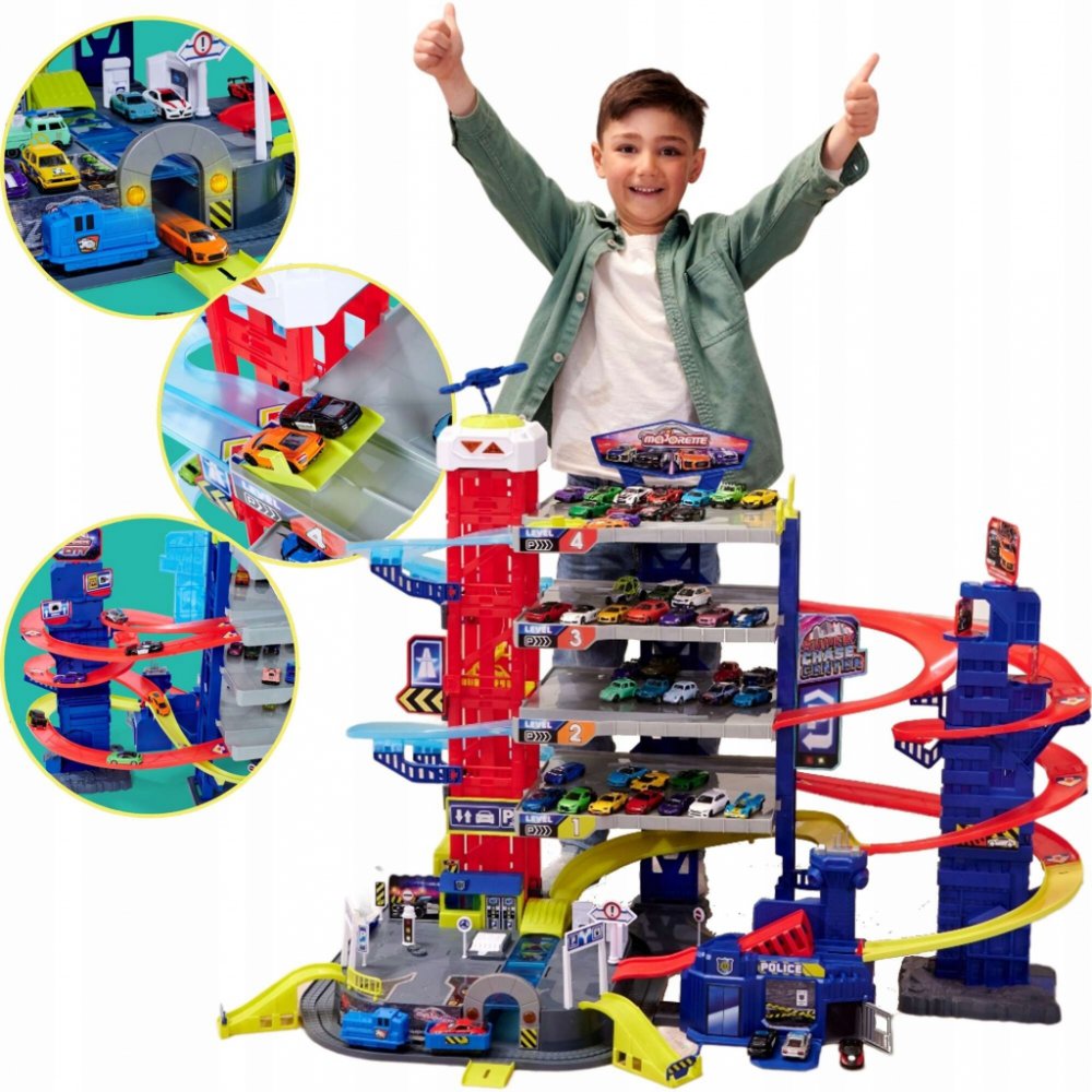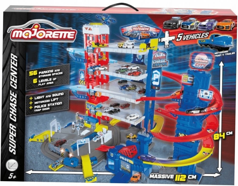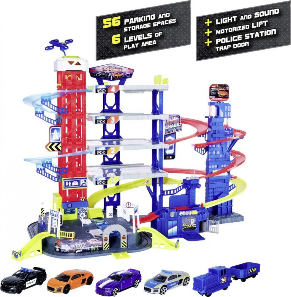 5 podlaží, motorizovaný výtah, 2 různá světla a zvuky, 4 kovová autíčka, vláček na baterie, 57 parkovacích míst, dvojitá dráha, policejní stanice s padacími dveřmi, rozměry 112 x 70 x 84 cm.