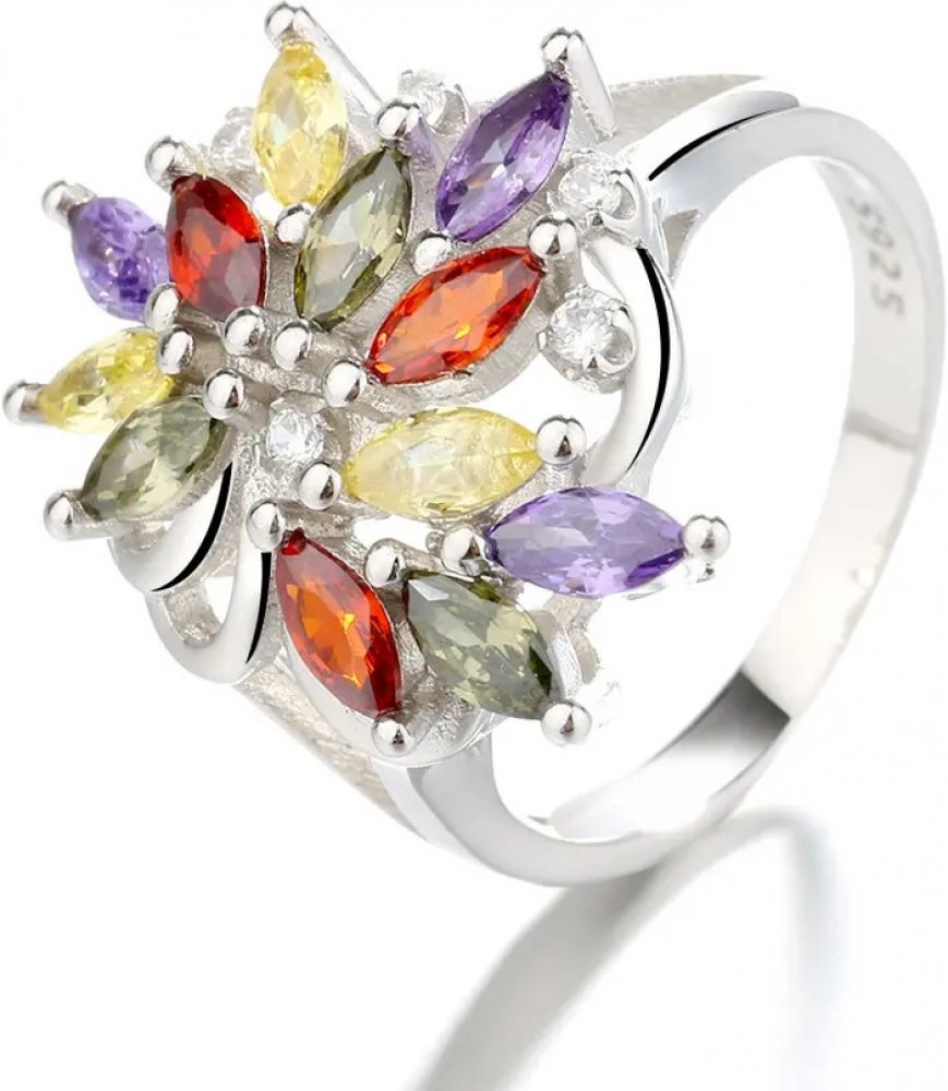 Červené, zelené, žluté a fialové zirkony jsou pečlivě usazeny do stříbrného prstenu, aby vytvořily květinový motiv, který je okouzlující svou pestrostí a jiskrou. Rozměr květu je 22 x 18 mm, což ho činí nejen viditelným, ale také nádherně elegantním.