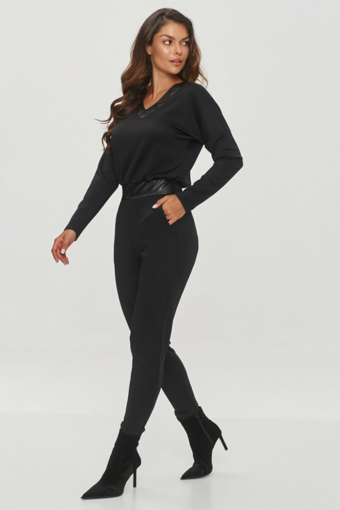 Overal Makadamia M850 je spojením elegance a moderního designu. Černé provedení působí sofistikovaně, zatímco detaily z eko-kůže dodávají celku jemný nádech luxusu. Výstřih do „V“ opticky prodlužuje krk, a pásek v pase krásně zvýrazňuje ženskou siluetu.Díky měkkému, lehce pružnému materiálu je overal mimořádně pohodlný a přitom dokonale drží tvar. Dlouhé rukávy, zúžené nohavice a diskrétní zip na zádech vytvářejí elegantní linii, ideální na večerní akce, společenská setkání nebo stylové pracovní schůzky.Kombinace elegance, pohodlí a špetky rockového stylu dělá z tohoto modelu univerzální outfit pro sebevědomé ženy, které chtějí zaujmout.