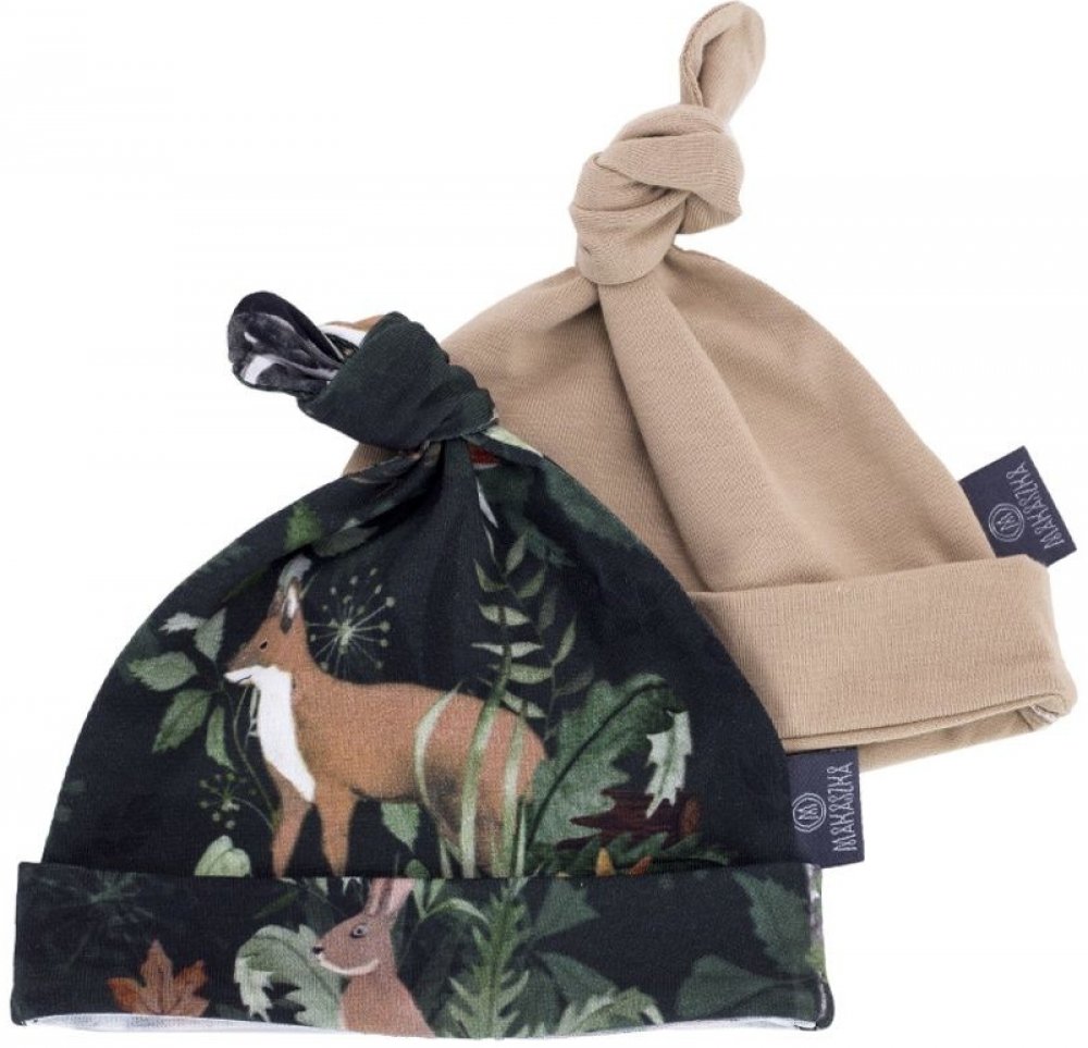 Sada 2ks čepiček pro miminko značky Makaszka - design: WOODLAND. Měkoučký, elastický prémiový úplet z organické bavlny s elastanem. Digitální tisk. Ideální pro citlivou dětskou pokožku. Vyrobené v EU. Materiál: 94% organická bavlna/6% elastan. Vyrábí se ve 2 velikostech "S" (0-3měsíce / obvod hlavy 32-34cm) a "M" (3-6měsíců / obvod hlavy 35-40cm).