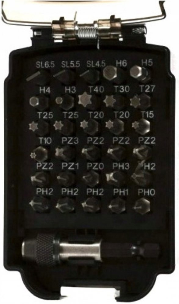 - Torx: T10, T15, T20 (x2), T25 (x2), T27, T30, T40