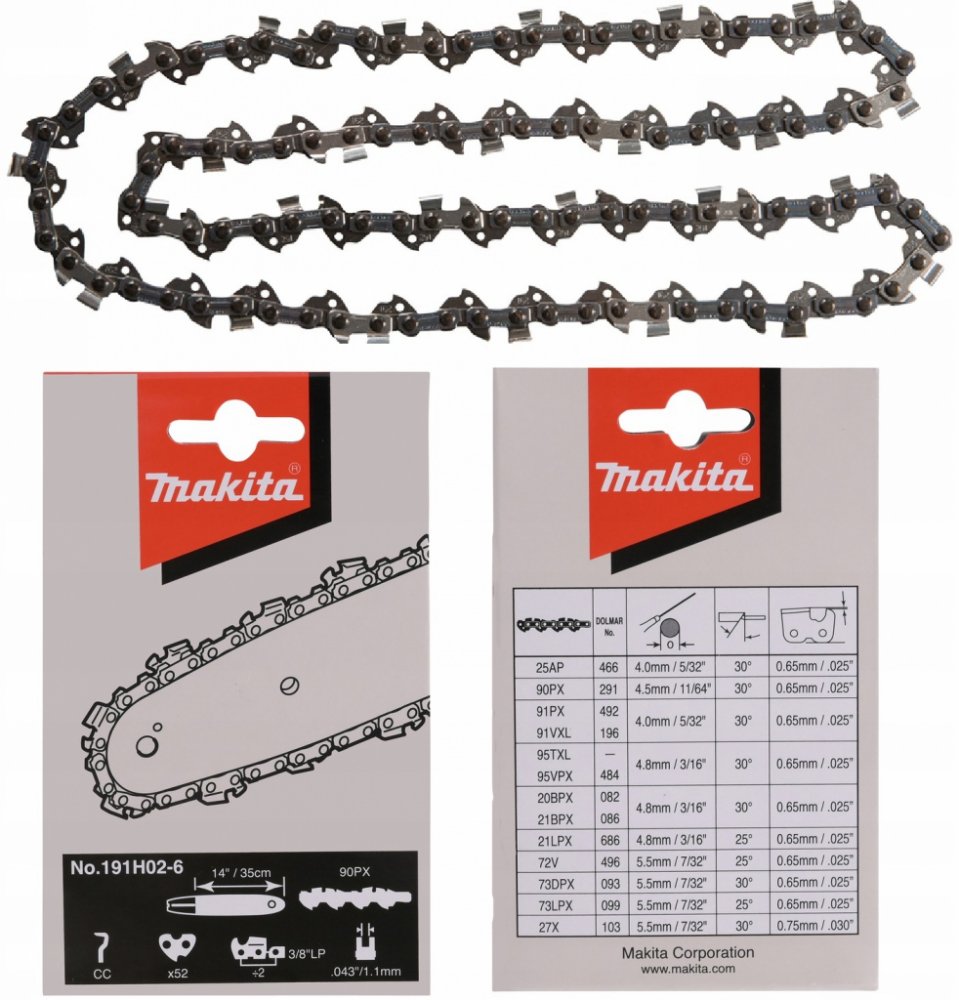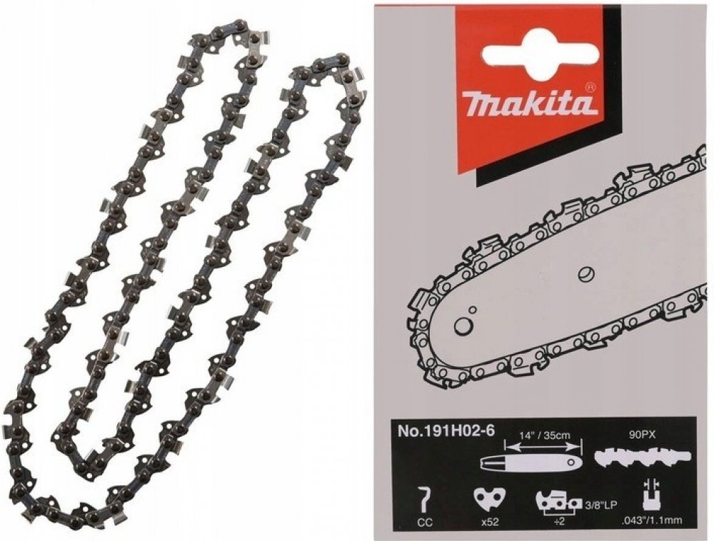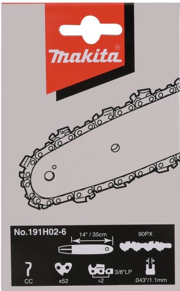 191H02-6 - Makita - Pilový řetěz Makita 35cm 1,1mm .043" 3/8"LP 52čl 191H02-6 - Příslušenství | Pilové řetězy - Pilový řetěz Makita Dokonale ostrý a odolný pilový řetěz Makita, je navržen pro profesionální řezání Jeho unikátní design zajišťuje dlouhou životnost a minimalizuje vibrace, což významně zvyšuje pohodlí uživatele Vyroben z vysoce kvalitní oceli, je kompatibilní s řadou pil Makita i dalších značek Použití tohoto řetězu znamená hladké a čisté řezy, efektivní práci a sníženou potřebu častého broušení Pro dosažení nejlepších výsledků a udržení optimálního výkonu doporučujeme pravidelné čištění a údržbu řetězu Foto je pouze ilustrativní, délku řetězu a počet zubů uvádíme v parametrech