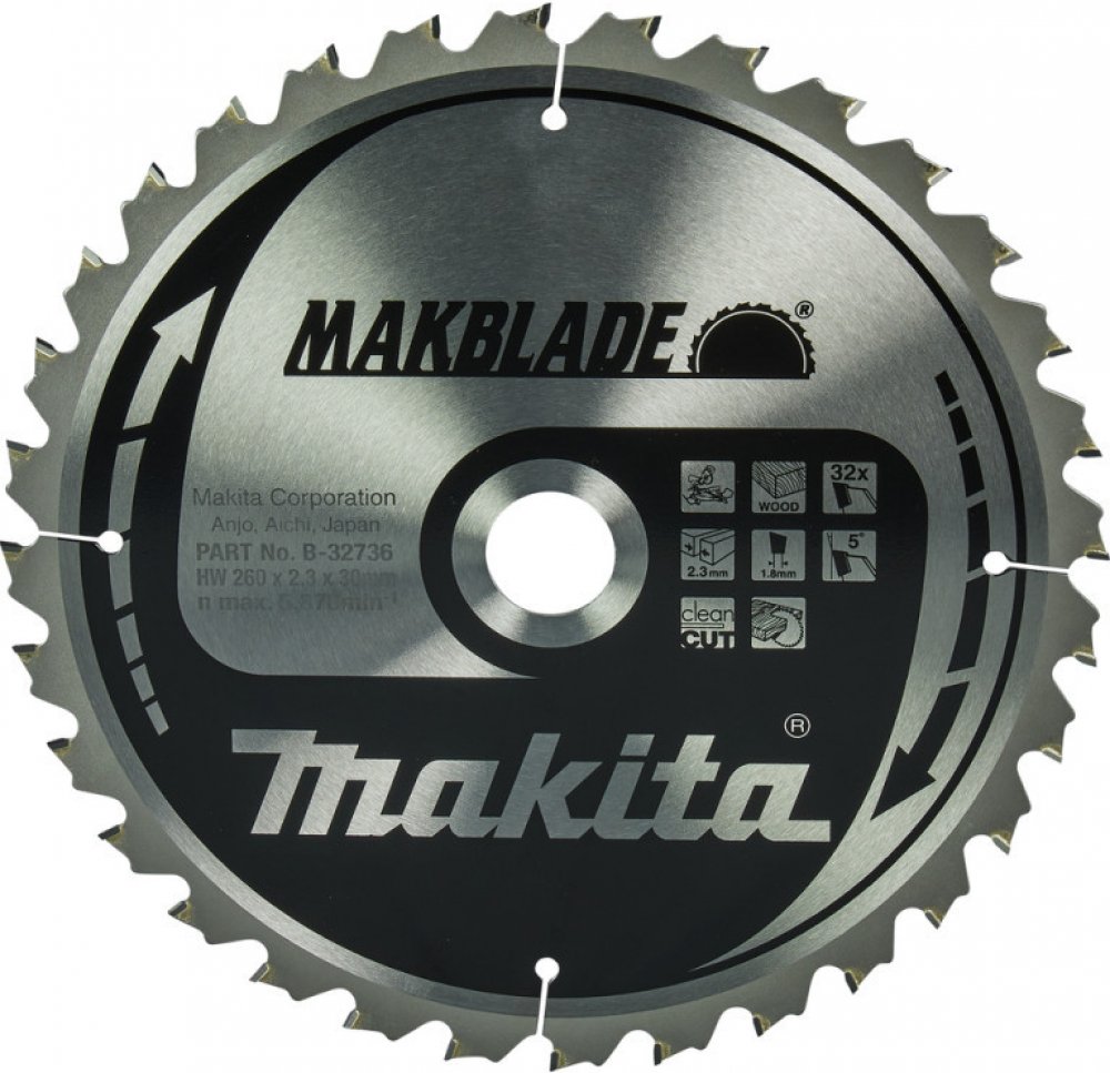 pilový kotouč 260x30 32T =old B-08931 Makita B-32736Standardní řada pilových kotoučů pro řezání dřeva pokosovými pilami. Konstrukce kotoučů je upravená pro spolehlivý řez a dlouhou životnost.
