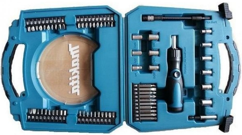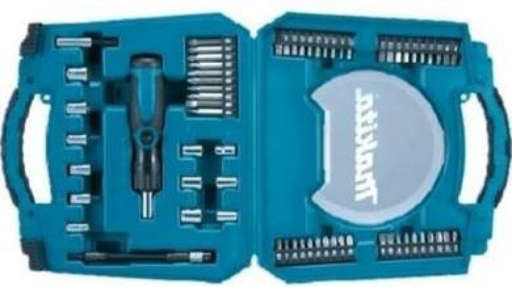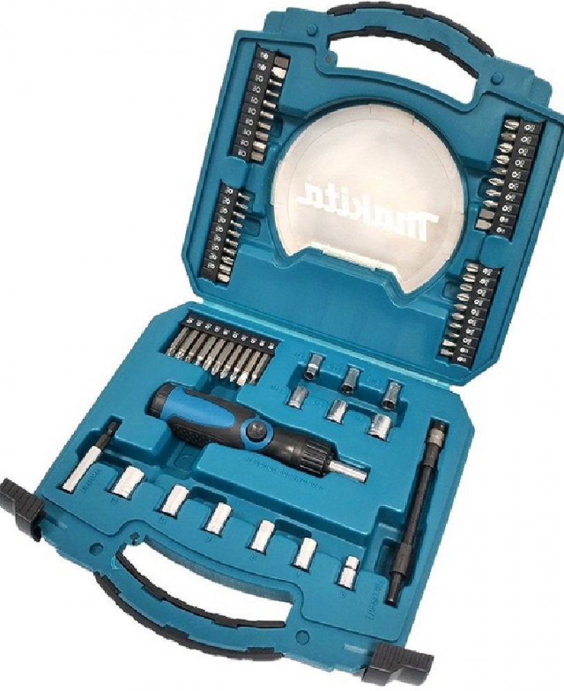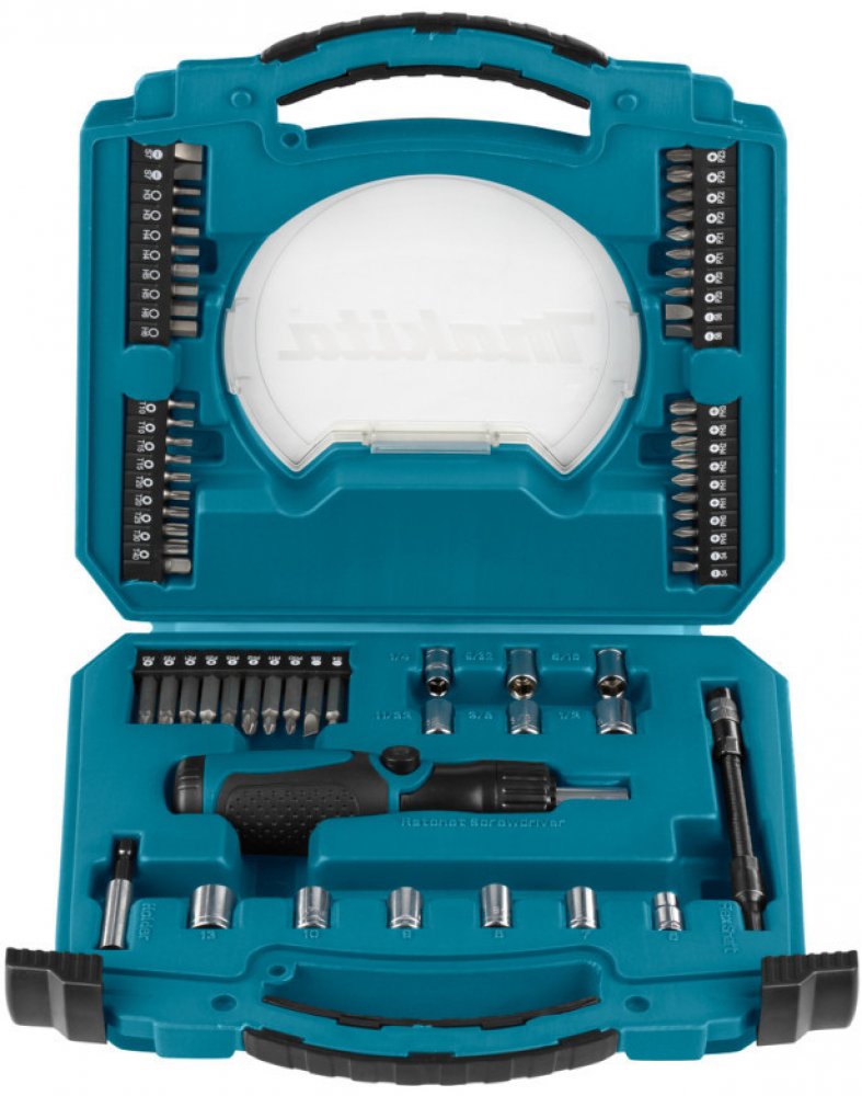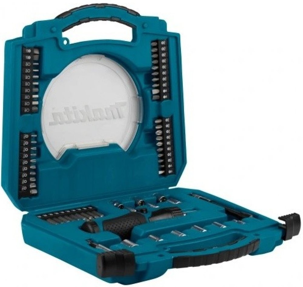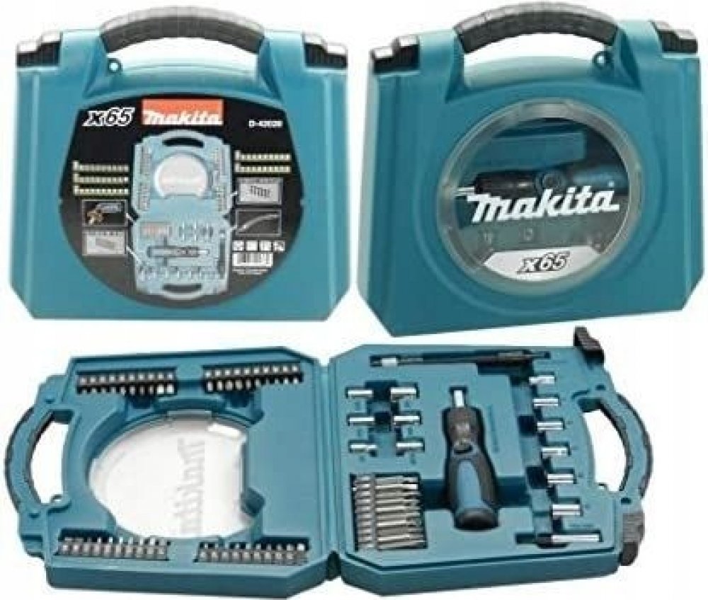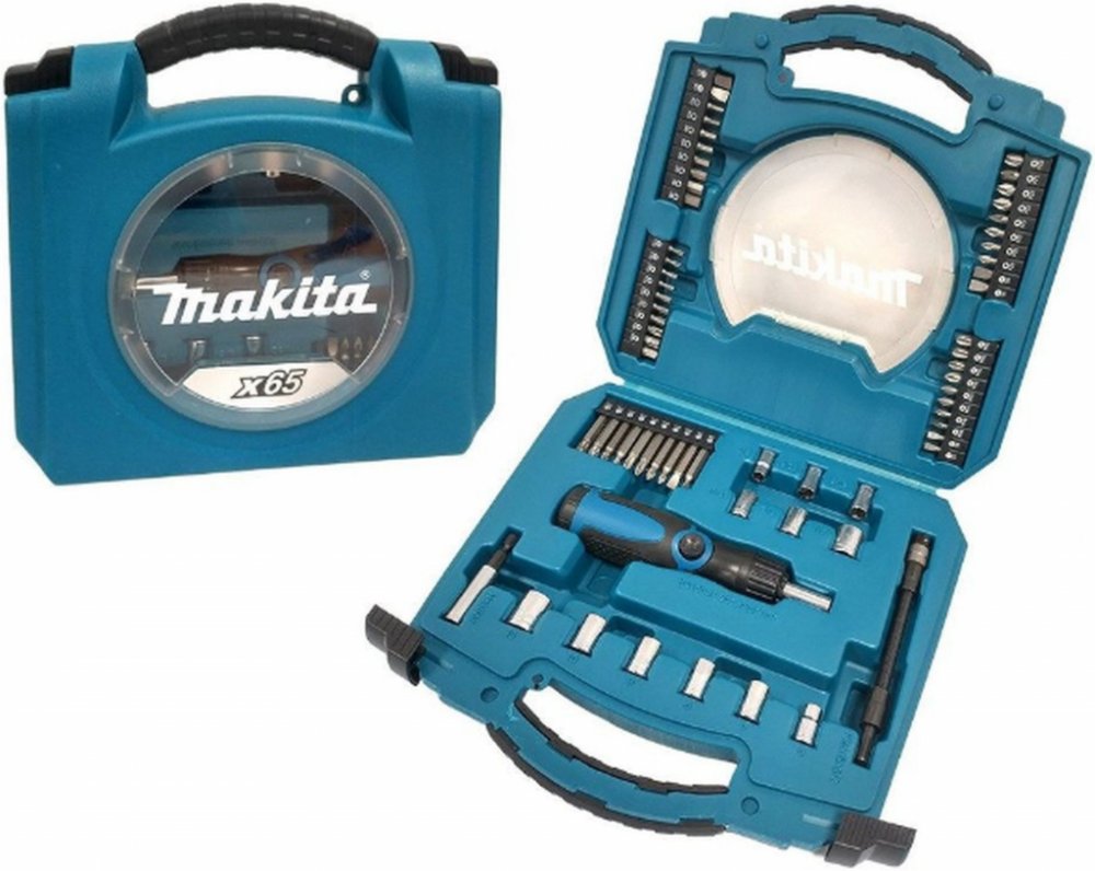 Popis: Všestranná sada 65 kusů nástrčných hlavic a bitů Makita v pevném plastovém kufříku. Tato sada obsahuje úhlově nastavitelný ráčnový šroubovák s magnetickým a flexibilním držákem bitů - šroubovací bity v různých velikostech uložených v pásech a nástrčné klíče v různých velikostech. Sada se skládá z: Drážkovací bity 25 mm: (2x) SL4 / (2x) SL6 / (2x) SL7 Drážkovací bity 50 mm: SL4 / SL6 Bit Phillips 25mm: (2x) PH0 / (2x) PH1 / (2x) PH2 / (2x) PH3 Bity Phillips 50 mm: PH0 / PH1 / PH2 / PH3 Bity Pozidriv 25mm: (2x) PZ0 / (2x) PZ1 / (2x) PZ2 / (2x) PZ3 Bity Pozidriv 50mm: PZ0 / PZ1 / PZ2 / PZ3 Bity Torx® 25 mm: (2x) T10 / (2x) T15 / (2x) T20 1x/ T25 / T30 / T40 Bity /Hex 25mm: (2x) H3 / (2x) H4 / (2x) H5 / (2x) H6 Adaptéry: 1/4″ - 9/32″ - 5/16″ - 11/32″ - 3/8″ - 1/2″ a po 1 kuse nástrčné hlavice 6 - 7 - 8 - 9 - 10 - 13 mm Ráčnový šroubovák, který jde nastavit do úhlového šroubováku 1 ks Zásobník na bity uložený v těle ráčnového šroubováku 1 ks (bez bitů)